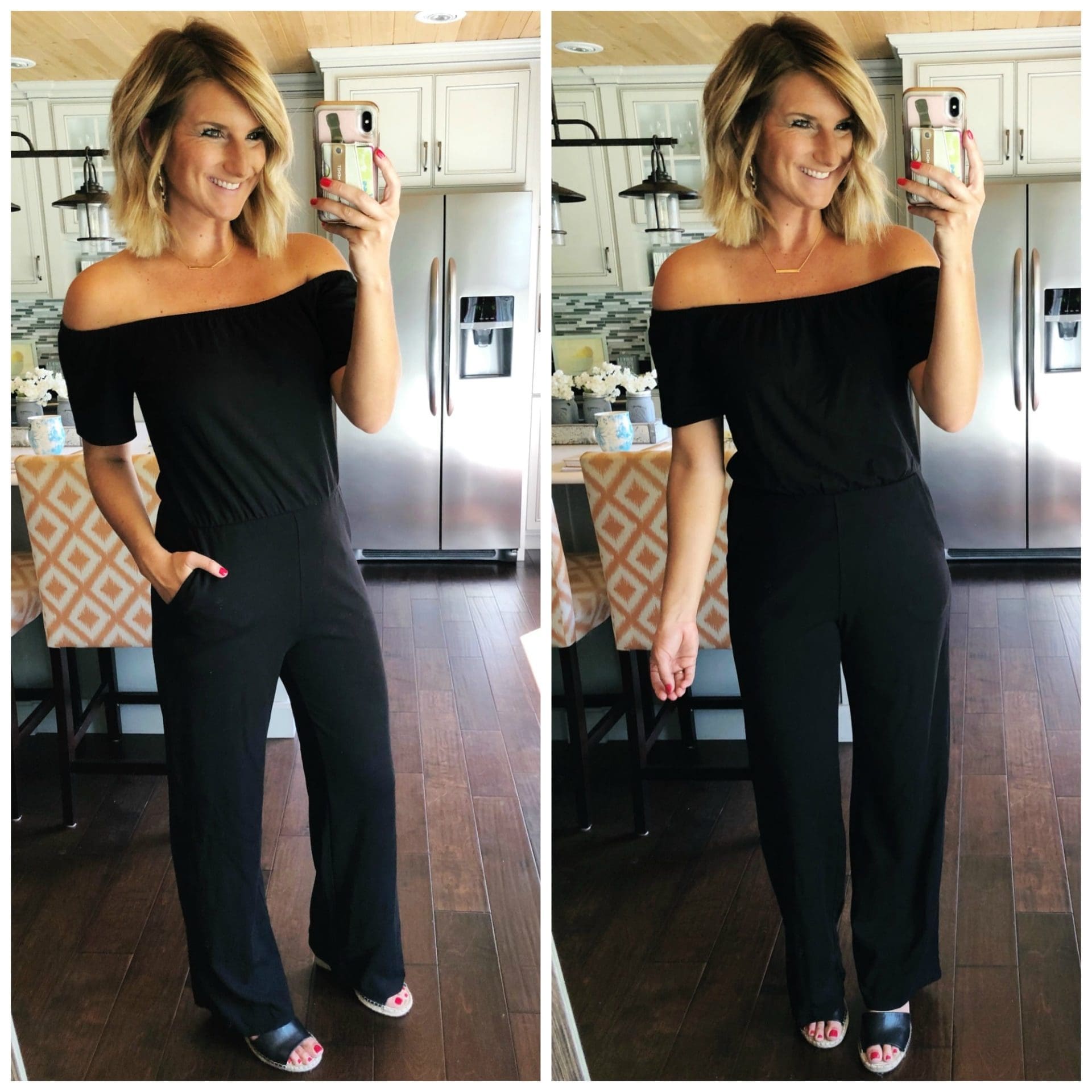 Gibson x Living in Yellow City Safari Off the Shoulder Ponte Knit Jumpsuit • Gibson [40% off! TTS, wearing in XS Regular] // Leera Espadrille Sandal – Vince Camuto [On sale! TTS] // Octagon Hoop Earrings – Amazon // Engraved Bar Necklace – Stella & Dot