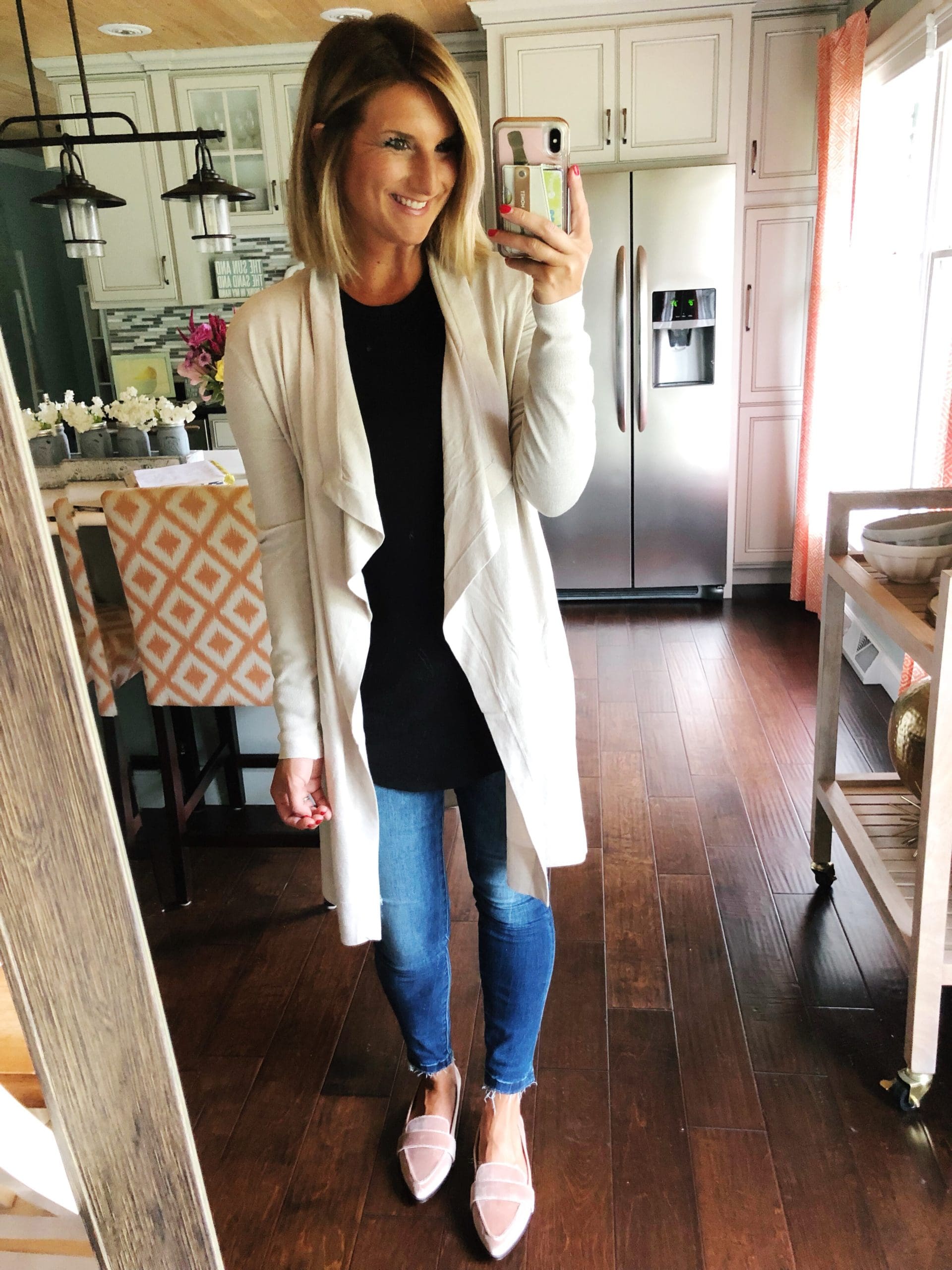 Long live the cardigan trend. This lightweight option is the PERFECT transitional piece for those cooler mornings and chillier evenings. The fabric feels great and I love the drape look. Lounging, Target runs, Saturday’s on the sideline, date night with your guy, I don’t think it matters the occasion to be able to wear this!