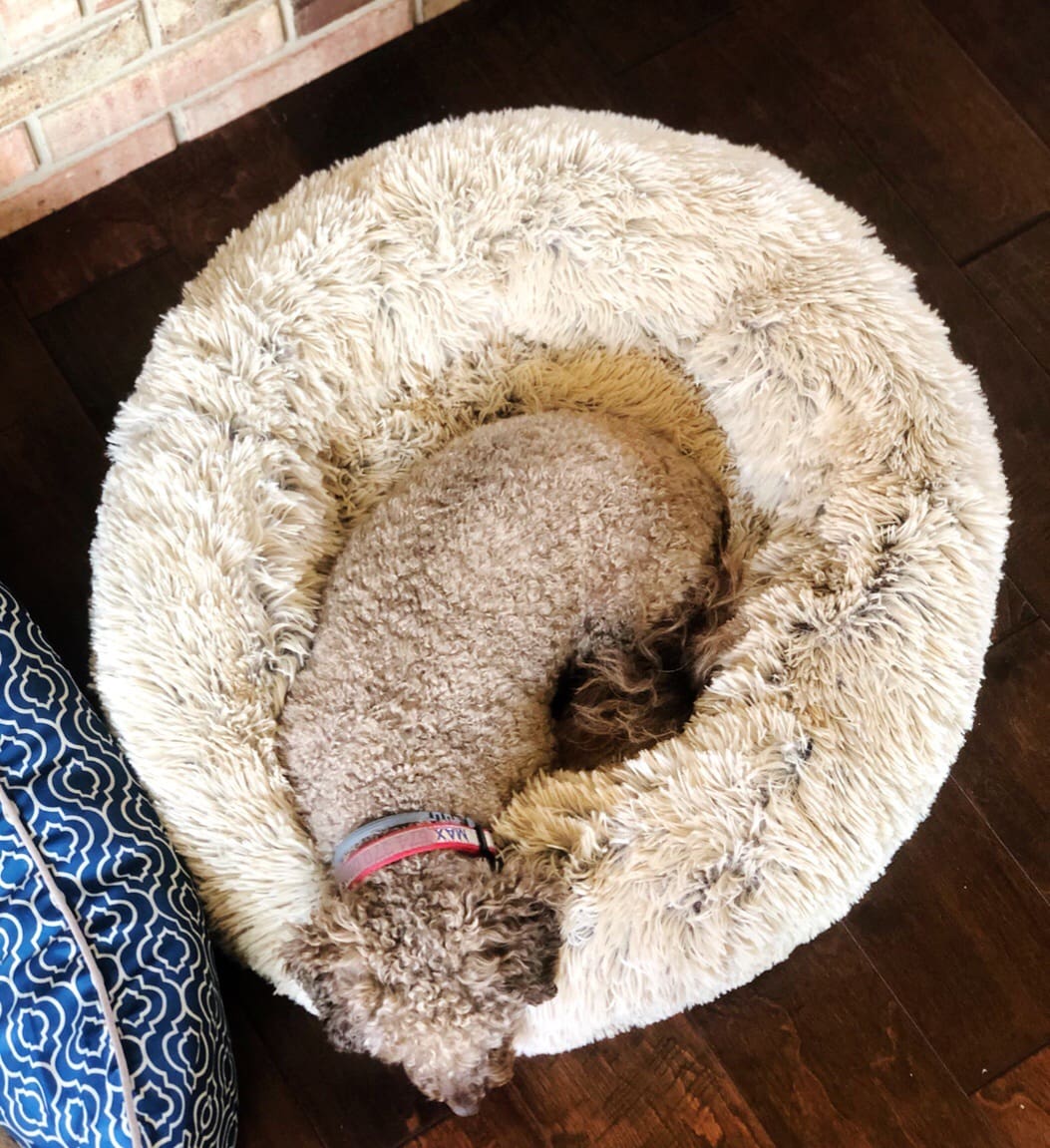 Could a dog get any cuddlier than this? It’s no secret that Max & Ollie are slightly spoiled in our household [if only you knew how many treats were consumed in a day] so when I spotted this furry little donut-shaped pillow for them to lay in, I knew I had to order it for them. The verdict is in: they are never moving out of it. They love to be able to rest their head on the furry little outside ring and it’s just their size [they are 15 pounds]. There are larger sizes available depending on your pup’s size! We have size small- 23 inch in Taupe!