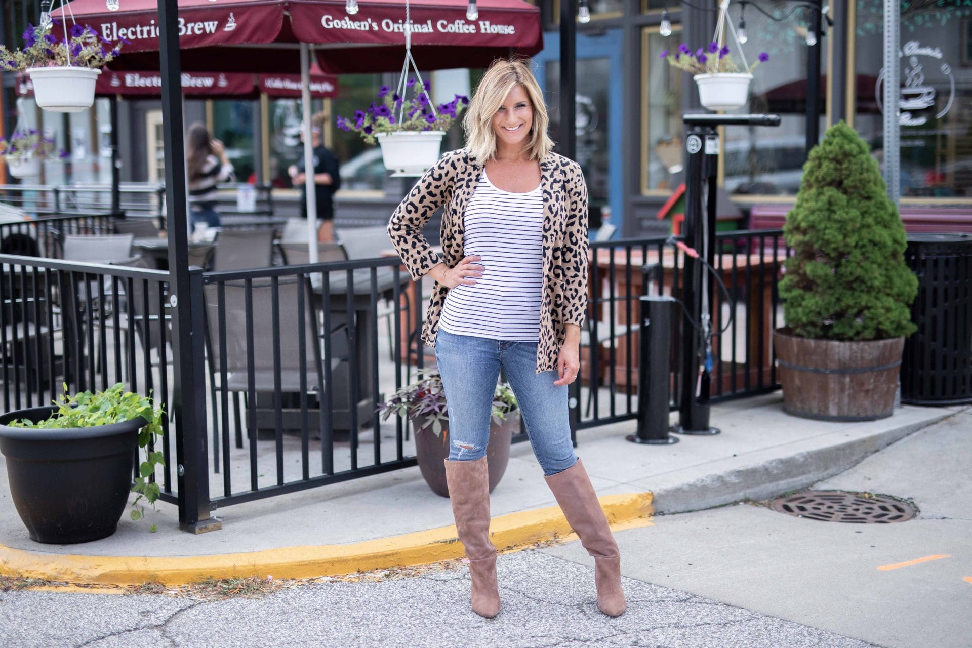 Sophie open-front sweater-blazer in leopard [true to size] //Â Universal Thread Striped Tank [size up one, wearing in small] // KUT from the Kloth Donna Button Fly Ankle Skinny Jeans [true to size] // Vince Camuto Kreesi Block Heel Bootie [true to size]