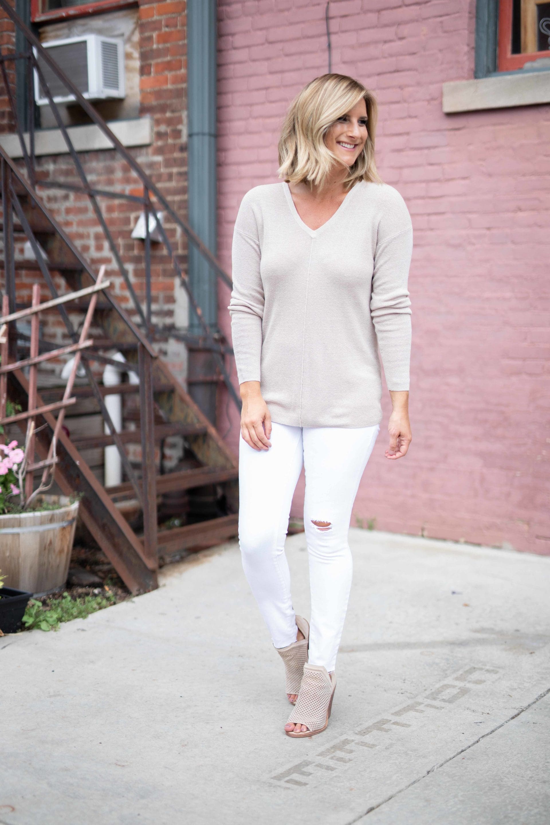 Caslon® V-Neck Sweater [size down if in between, wearing in XS] // STS Blue Emma Cutoff Hem Crop Jeggings [size up one] // Vince Camuto Kensa Booties [true to size]