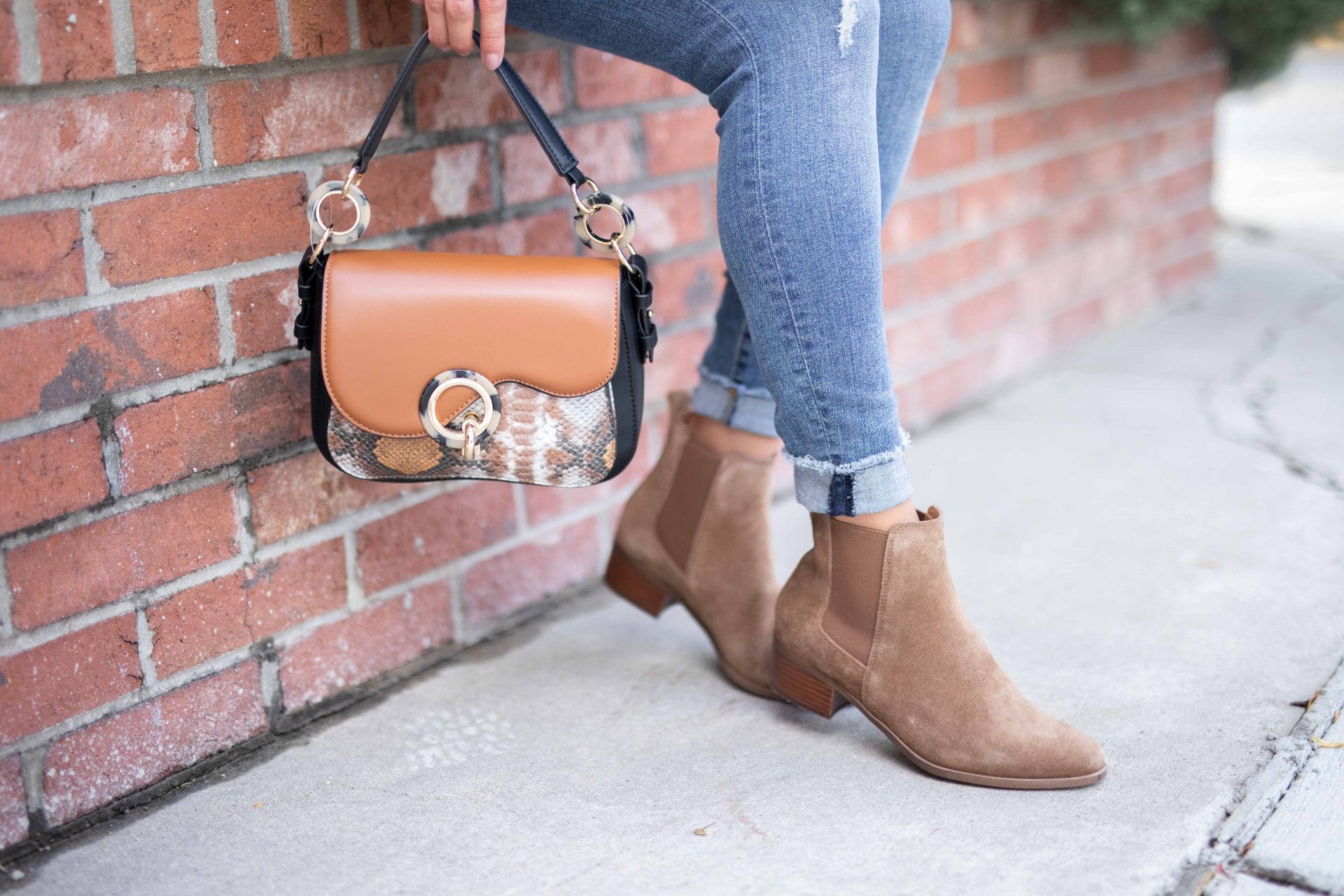 A New Day Women’s Long Sleeve V-Neck Pullover Sweater [size up if in between, wearing in small] // Topshop Carlo Shoulder Bag //Â Steve Madden Dover Chelsea Bootie [true to size]