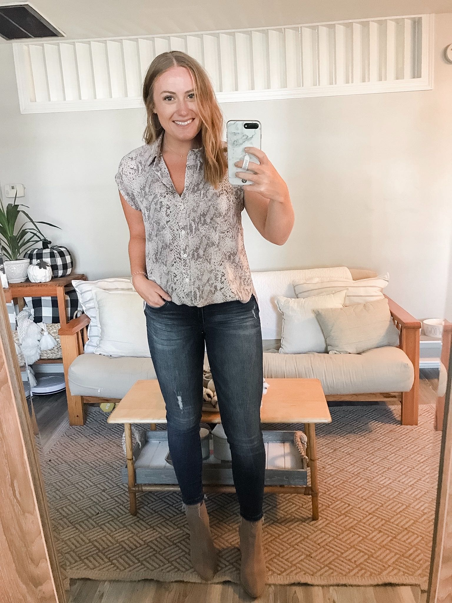 While I’m terrified of snakes, I don’t mind integrating this fun trend into my fall wardrobe. The top could easily be dressed up or down to take you from work to play. It’s slightly flowy which works well for tucking, tying, or wearing as-is. True to size, wearing in medium!
