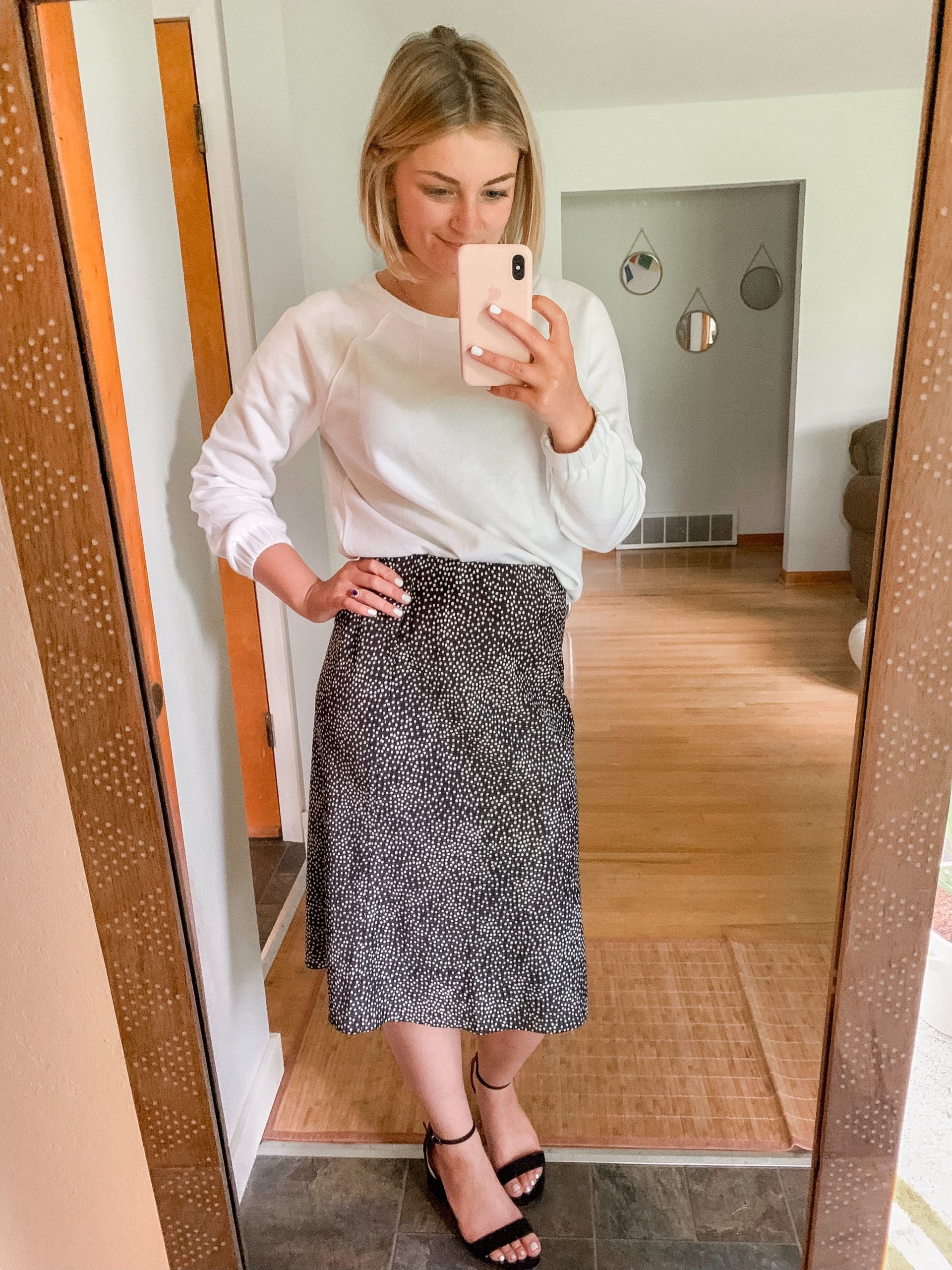 FUN FACT: As I was shopping around LOFT I saw this midi skirt and loved how it was styled on the website, so I purchased the whole outfit! I found this sweater and attempted to recreate the look, even down to the shoes! The entire outfit is so cute but so comfortable! The skirt has an elastic waistband and the sweater features fun cuffed sleeves! This is a fun way to dress up a sweater/pullover! Both items are true to size, wearing XS in both!