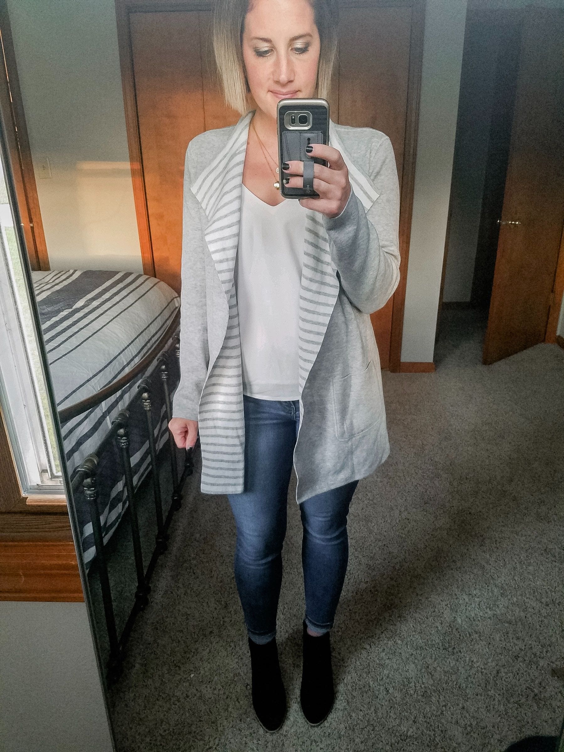This sweater jacket is SO fun! Not only is it reversible but has pockets on BOTH sides!! I love that it has the pop of color or print but in a subtle and classic way! It’s not super heavy but perfect for early/mid Fall or if you are in warmer states perfect for the cooler weather you have! Work appropriate and if you spill on one side, just reverse that baby and no one will even notice! Wearing regular length but it was a bit long [slightly large] for my petite frame! [True to size, wearing XS in Subtle Grey Heather]