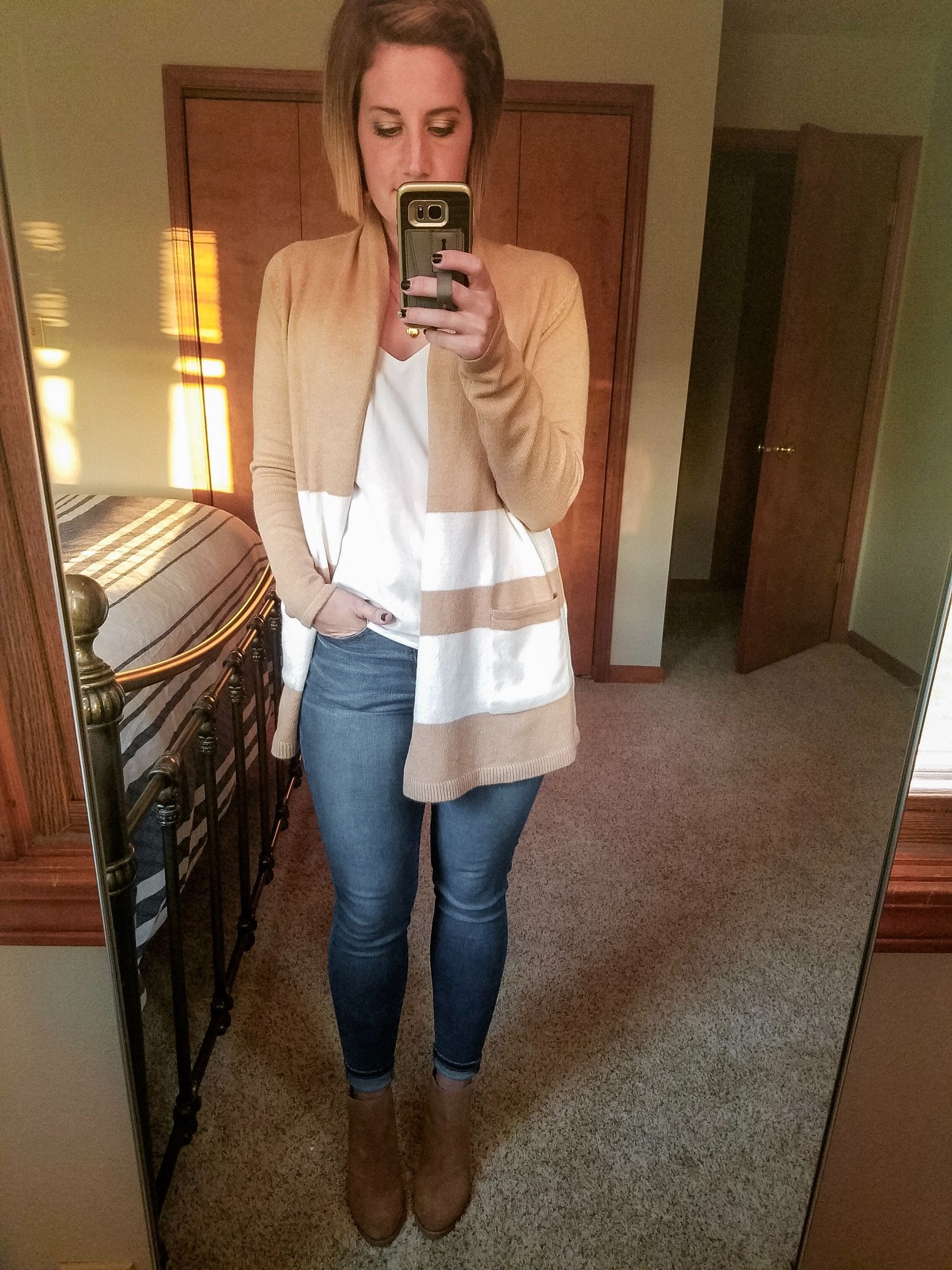 OH my I love this cardigan!! SO cozy and the color blocking white and camel is perfect for Fall! The perfect length and pairs so well with a layering cami or tee! Can’t recommend this one enough! [True to size, wearing XS Petite in Toasty Camel]
