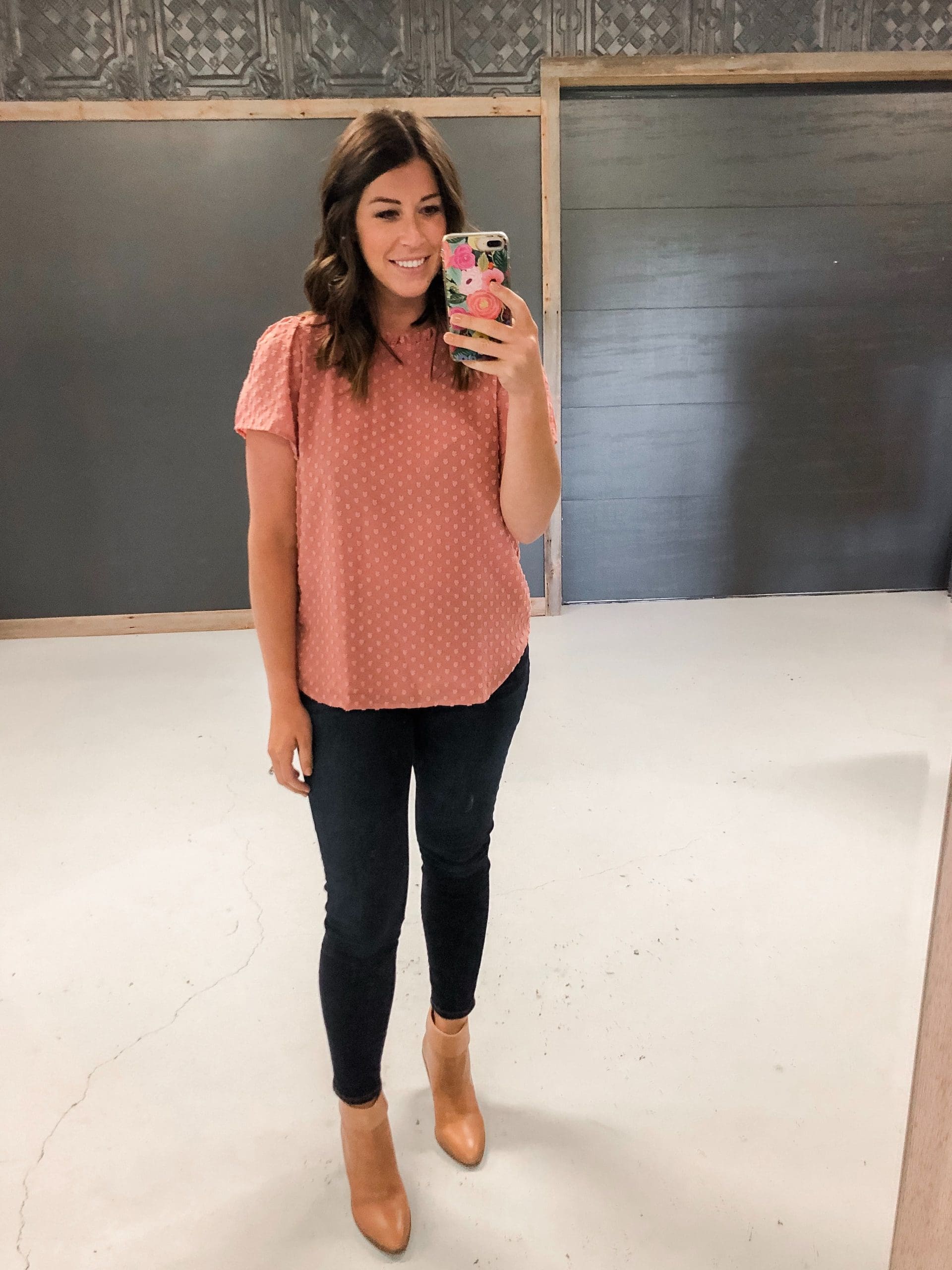 Dots & ruffles- yes please! I absolutely love this top! From the feminine fit and ruffled neckline, to the textured dots, to the curved hemline, there is nothing about this top that I don’t love! It will be great to wear alone with jeans or dress pants, and will be great under a moto jacket to give it a more edgy vibe! True to size, wearing medium!