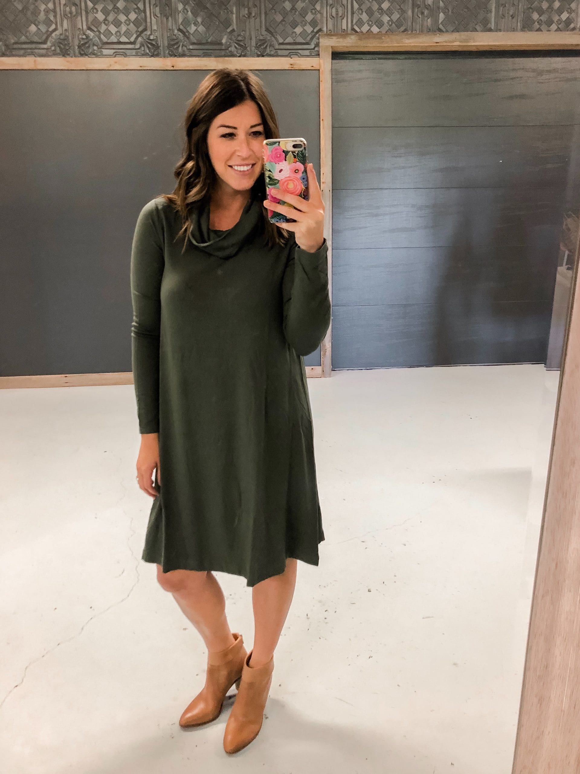 The SOFTEST fabric imaginable! Fall weather screams a sweater dress and boots or booties, and this is the dress for that! I paired it with booties, but think it would be so cute with tall boots and a belt! It’s got the perfect amount of flow to it and a great cowl neck for those cool days! True to size, wearing medium!