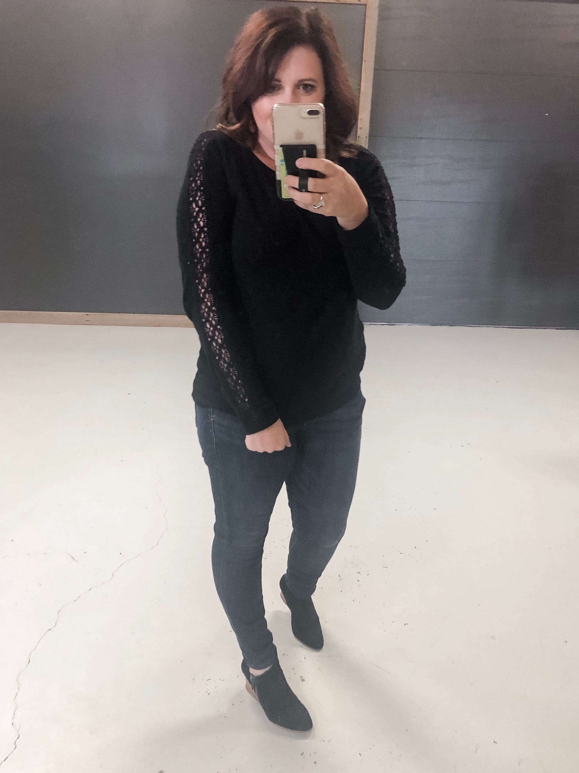 While it was absolutely no surprise to my closet to find itself with ANOTHER black top – I have zero regrets about adding this one into the mix! Here’s why it’s different: those sleeves + regular bra friendly. I’ve been in search of a sweater with lace accents on the sleeve but am constantly disappointed that the lace goes to the neckline, causing straps to show or a strapless bra to be worn… with a sweater. No thank you! A subtle way to add some fun feminine detail without being too “Look at my doily sleeves!” The weight of this top is Fall perfection and I love how it can be dressed up for the office or worn casually. Can’t wait to wear this one until the snow starts falling and again in the Spring. TTS, wearing medium!