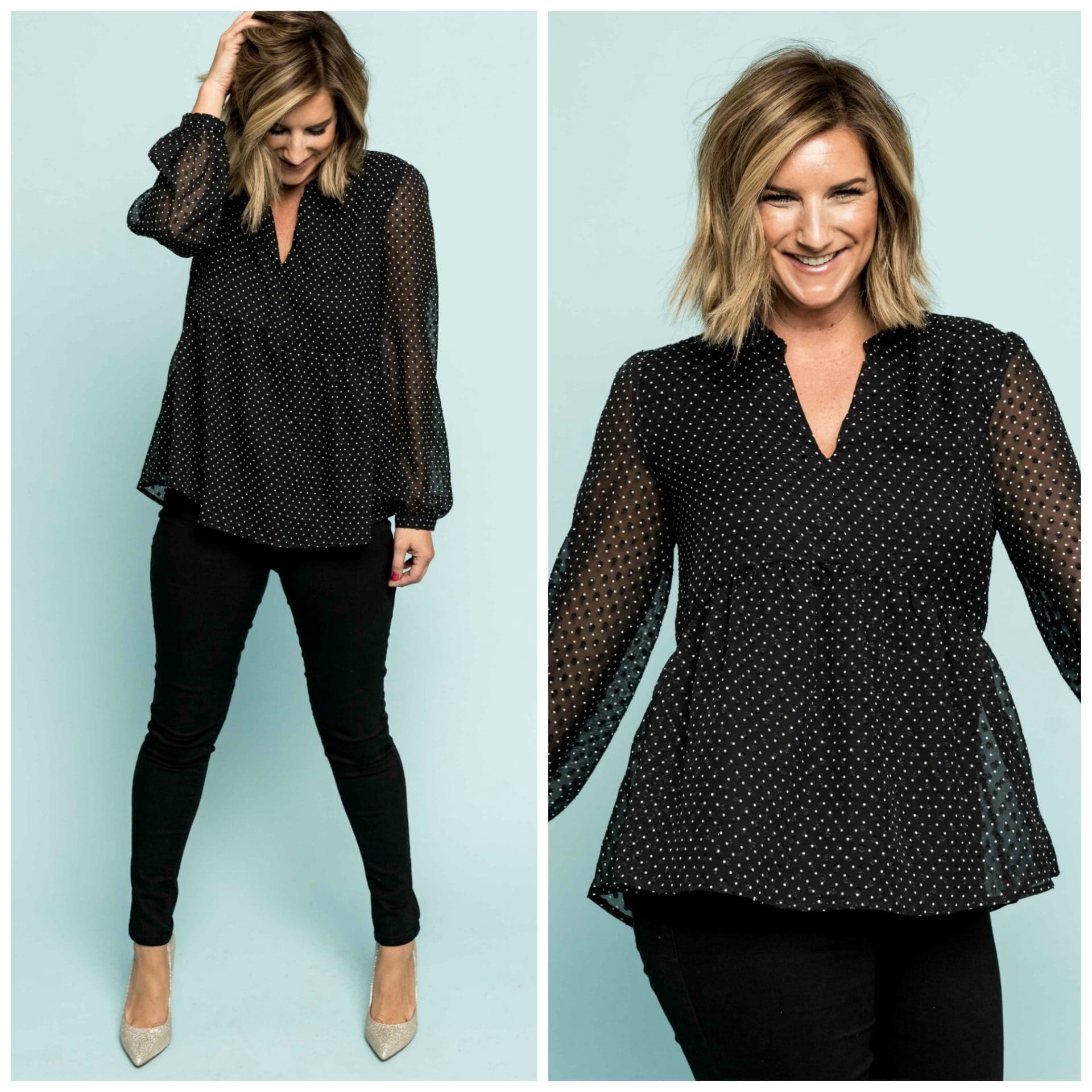 Whether you’re looking for something to wear around the Thanksgiving table, for Christmas Eve, your work holiday event, girlfriends Favorite Things Party and the list goes on, there is an outfit for you here! This collection has 19 pieces from tops to sweaters, pants, dresses and jumpsuits and the best part — it’s inclusive sizing meaning it is offered in petite, standard and extended sizes! Because we have a lot to get into, I’m going to get right into the pieces that makes up this Gibson x Glam collection! Let the festivities begin….