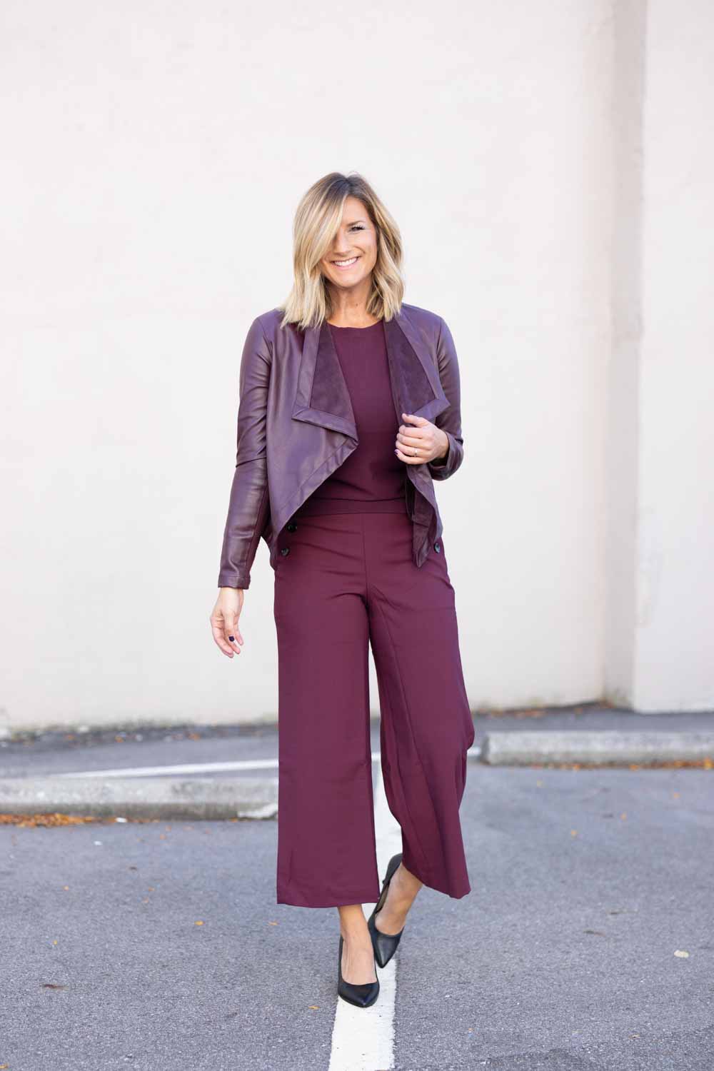 BB Dakota Teagan Reversible Faux Leather Drape Front Jacket [TTS, wearing size XS in Fig] // Halogen Back Detail Sweater [TTS, wearing size XS in Burgundy Fig] // Halogen Wide Leg Crop Pants [TTS, wearing size 2 in Burgundy Fig] // Nine West Tatiana Pump [TTS, wearing in Bordeaux Leather]