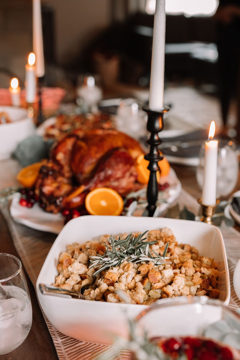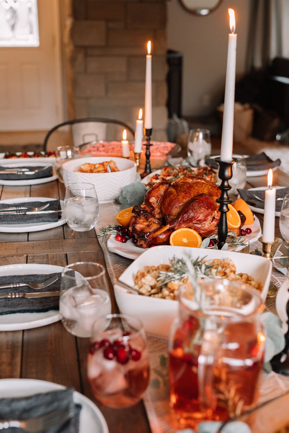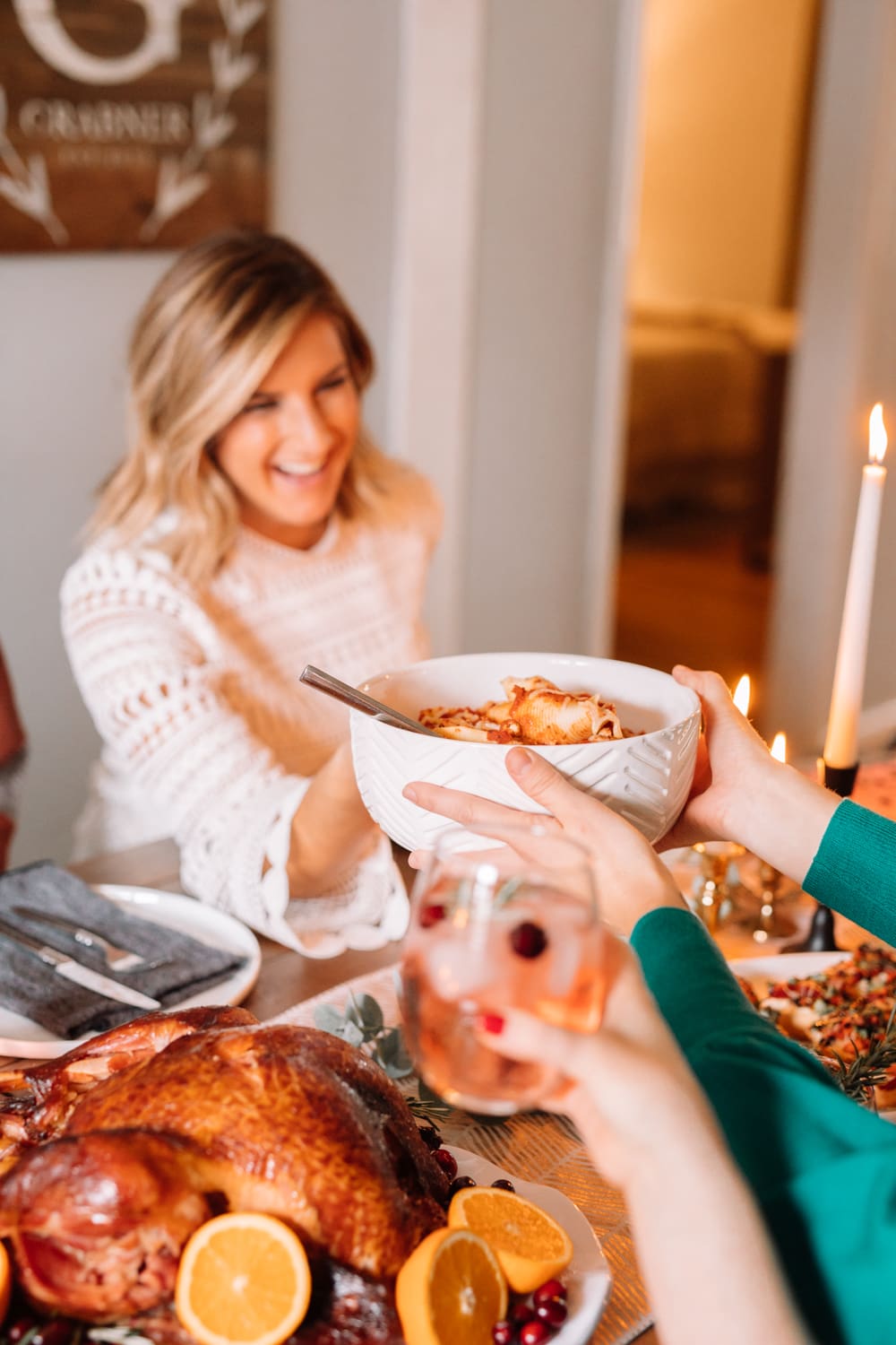We recently gathered for our second annual holiday meal where we each bring a dish [or drink] to share and because we want to make sure you’re well fed this holiday season, we are bringing you all of the recipes that we made [and devoured] in this free holiday cookbook! Included are a festive bruschetta, vegan stuffed shells, a delectable green bean casserole, stuffing, a turkey worth talking about, holiday rose and a must make dessert which you’ll see below! There is nothing greater than gathering around the table with people you love and spending time catching up, laughing, sharing stories and of course – eating. Full stomachs = full hearts and empty glasses = fuller hearts. I think we can all cheers to that!