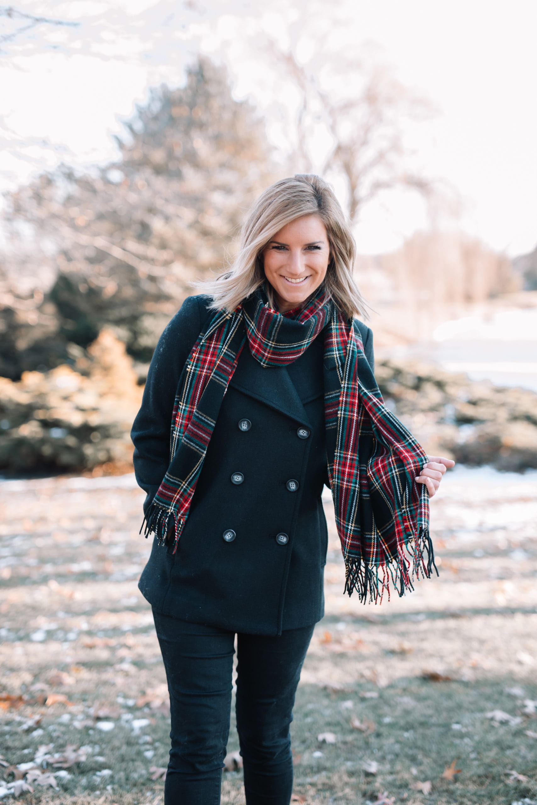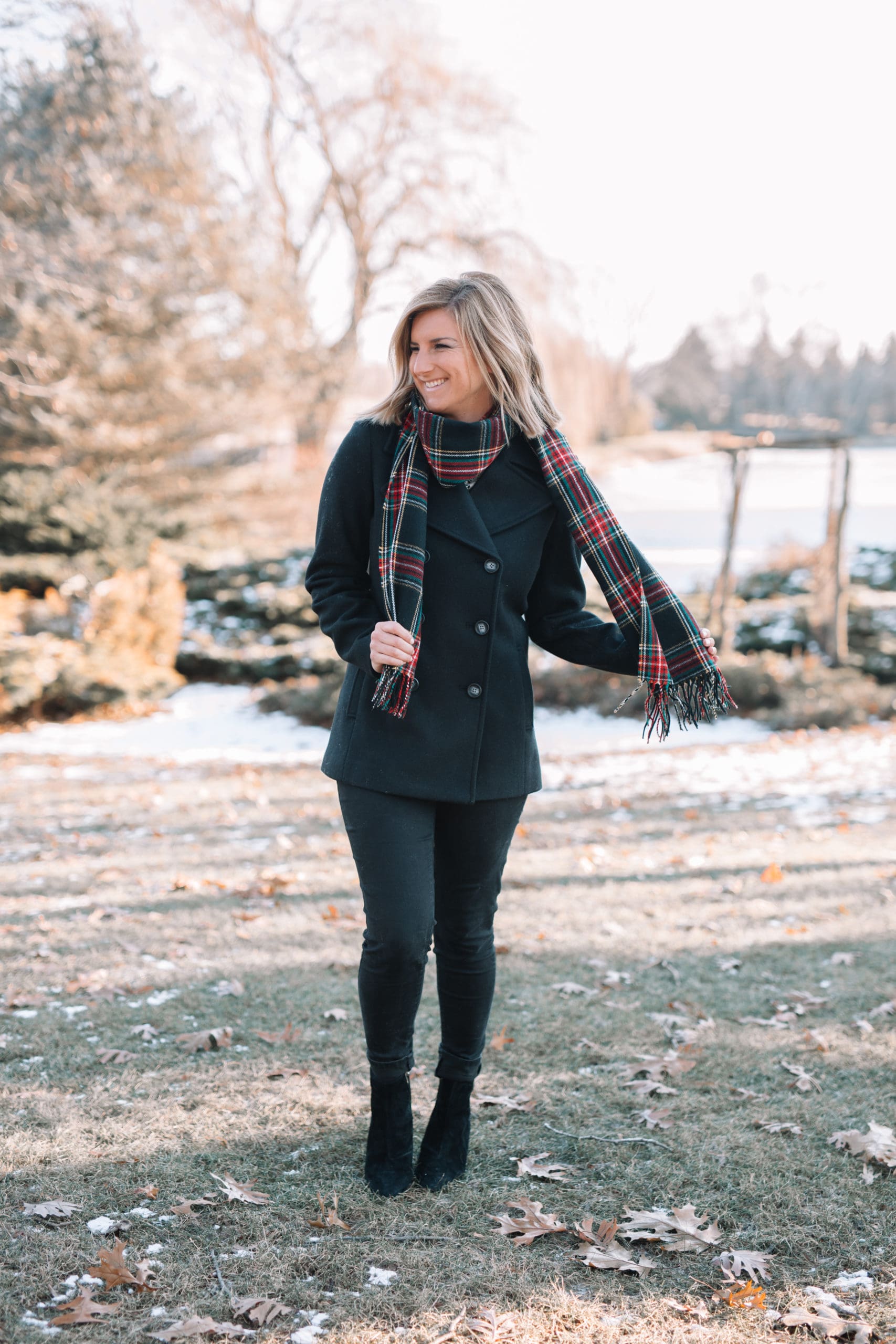 Soft-Brushed Peacoat [TTS, wearing size small] // Classic Plaid Scarf  [wearing in Stewart Tartan Black Red] // Jeans [size down one] // Booties [true to size]