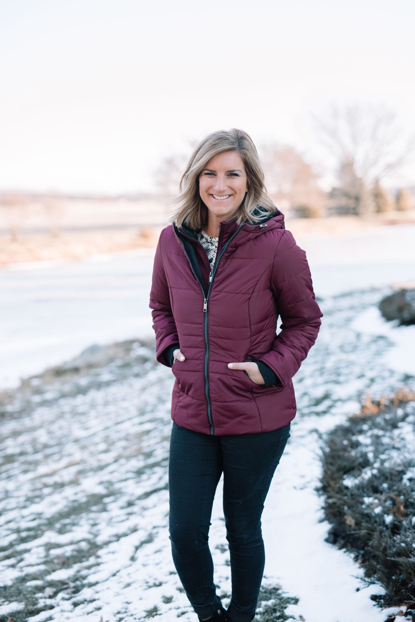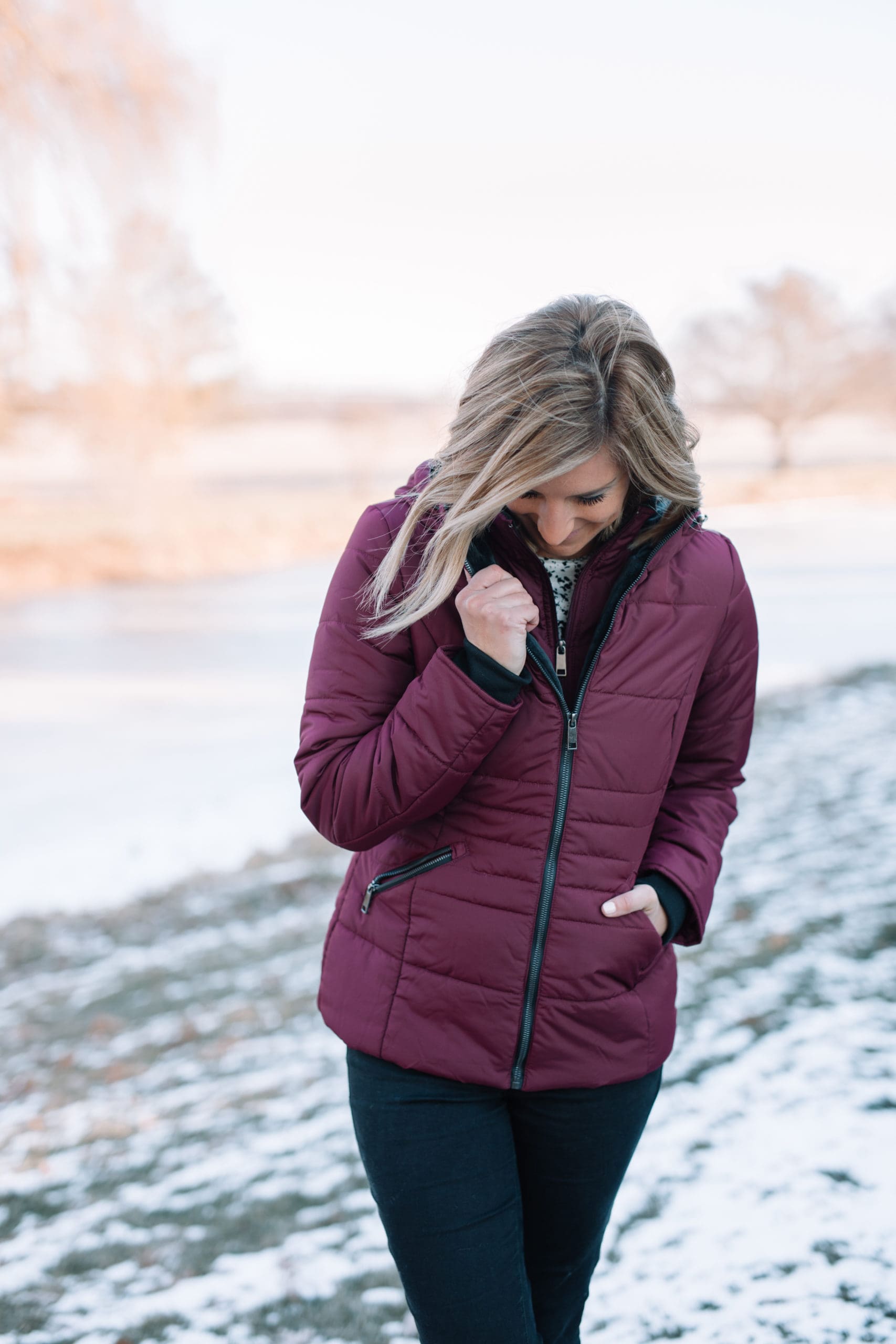 Moving onto insulated coats for those extra cold days, this pretty burgundy coat will definitely keep your top half toasty! It has a stand-up collar on the inside to keep your neck more protected from the wind! And did I mention that the color is technically called Zinfandel, which is a wine, which is a win. Therefore, this coat is a win. That’s Erin math for you!