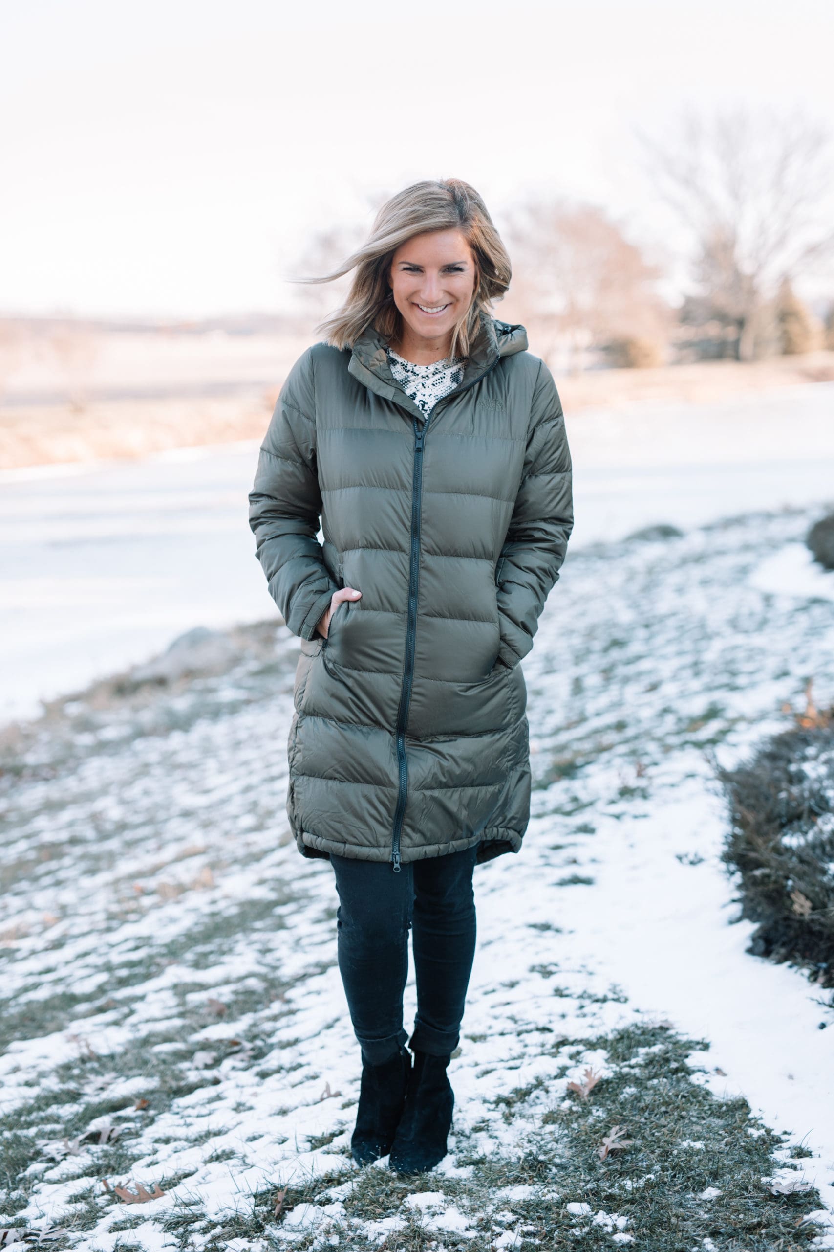 The North Face Metropolis III Down Parka [TTS, wearing size small in Taupe Green] // Jeans [size down one] // Booties [true to size]