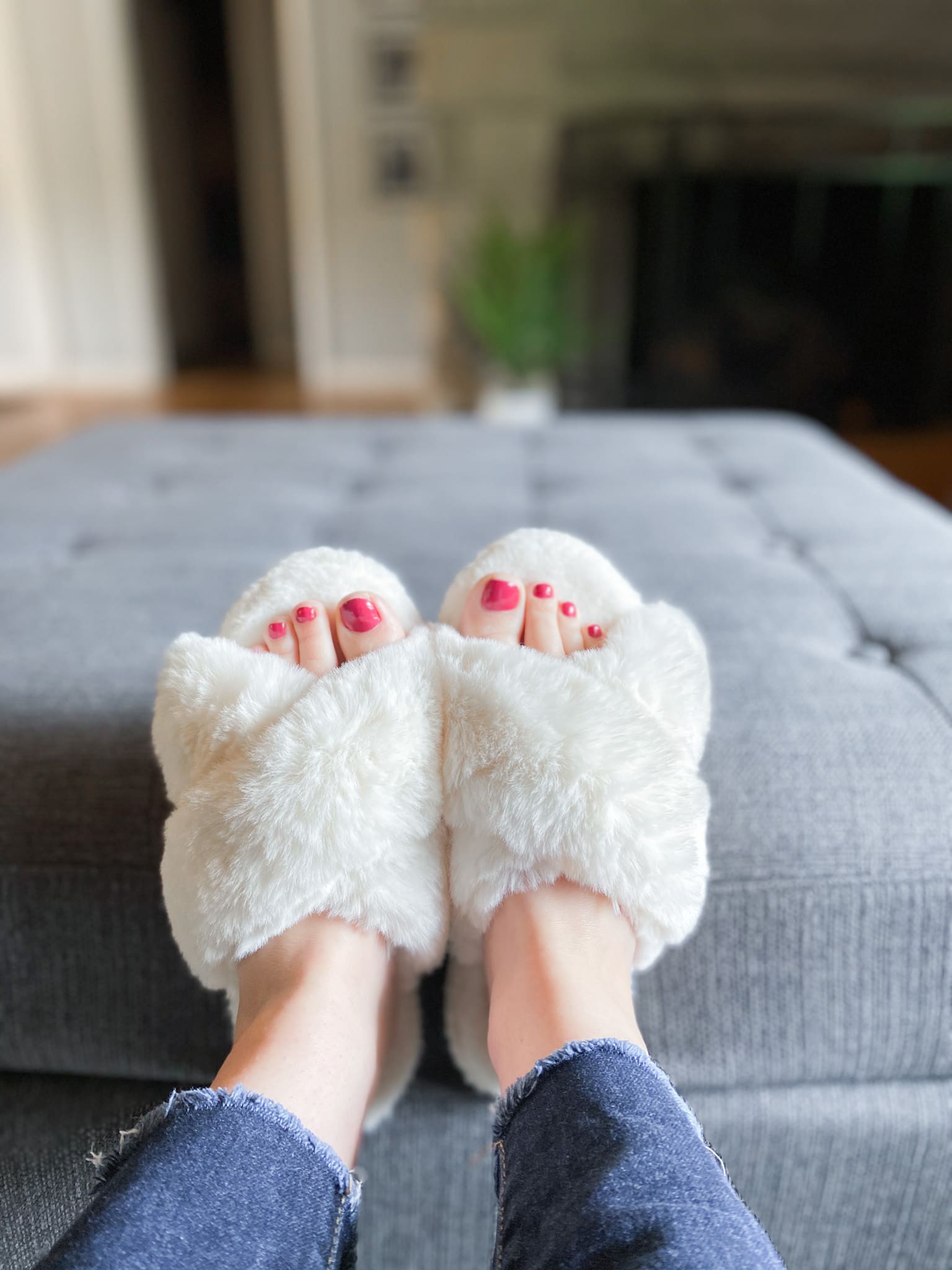 I have long since put my fuzzy Ugg loafer slippers away for the season, but I am finding myself missing the coziness of wearing them around the house. While it is far too warm for that pair this time of year, I still wanted something to warm my feet indoors. These slippers are the perfect little fuzzballs to keep my feet cozy, but the open toe allows for some airflow and to show off my summer pedicure [albeit, a diy home pedicure these days!] Plus, they have a hard sole, so I feel great wearing them out on the patio or to run and get the mail. Definitely happy with this purchase!