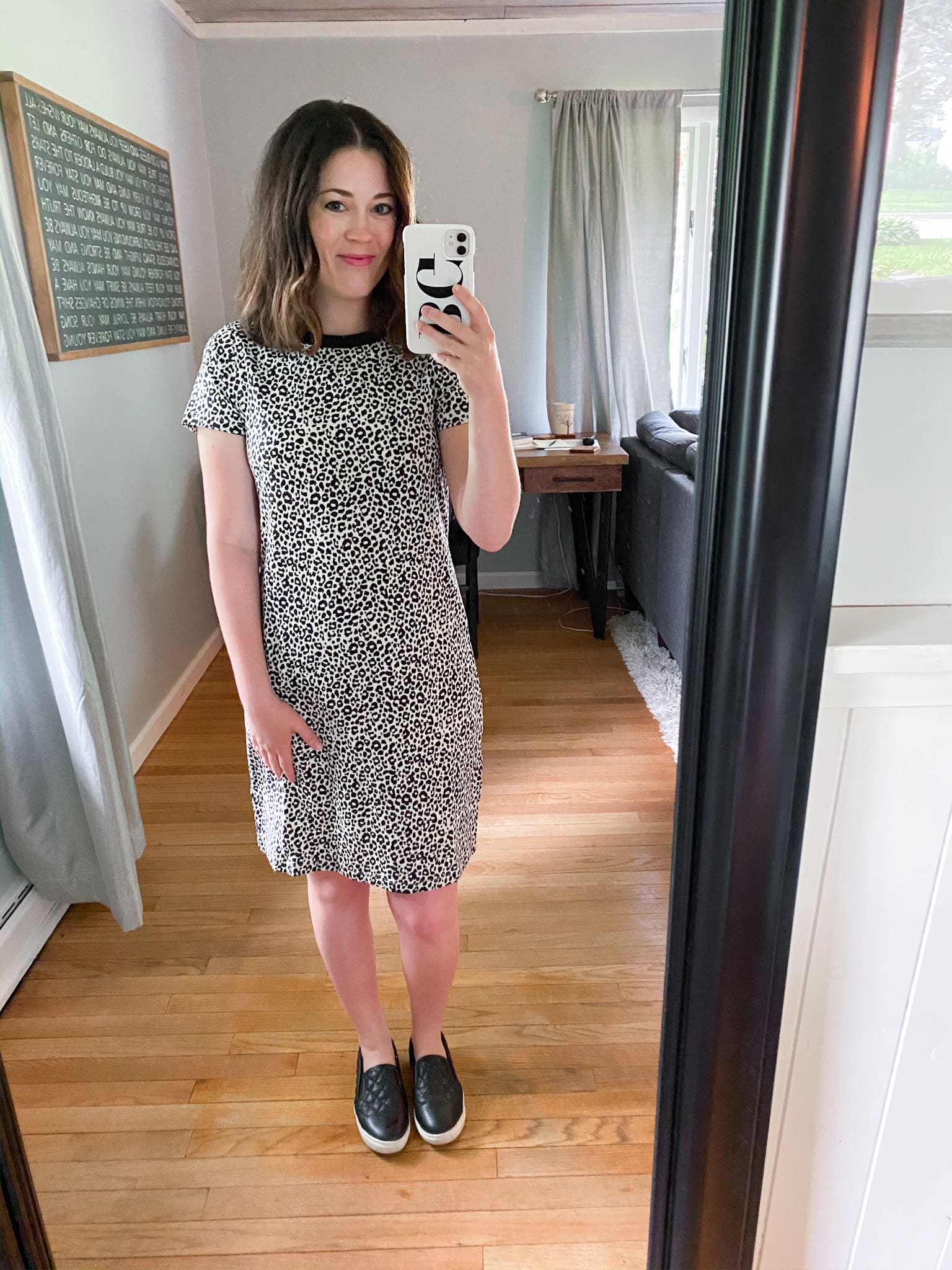 Normally, this work from home look would be accompanied by no makeup and a messy bun, but I thought I would put myself together a bit for the photo! This t-shirt dress is the perfect work from home option! It’s comfortable and more stretchy than other t-shirt dresses I have gotten in the past from Old Navy, which I like. I love the contrasting collar and the fun leopard print. This dress will be on repeat throughout the summer!
