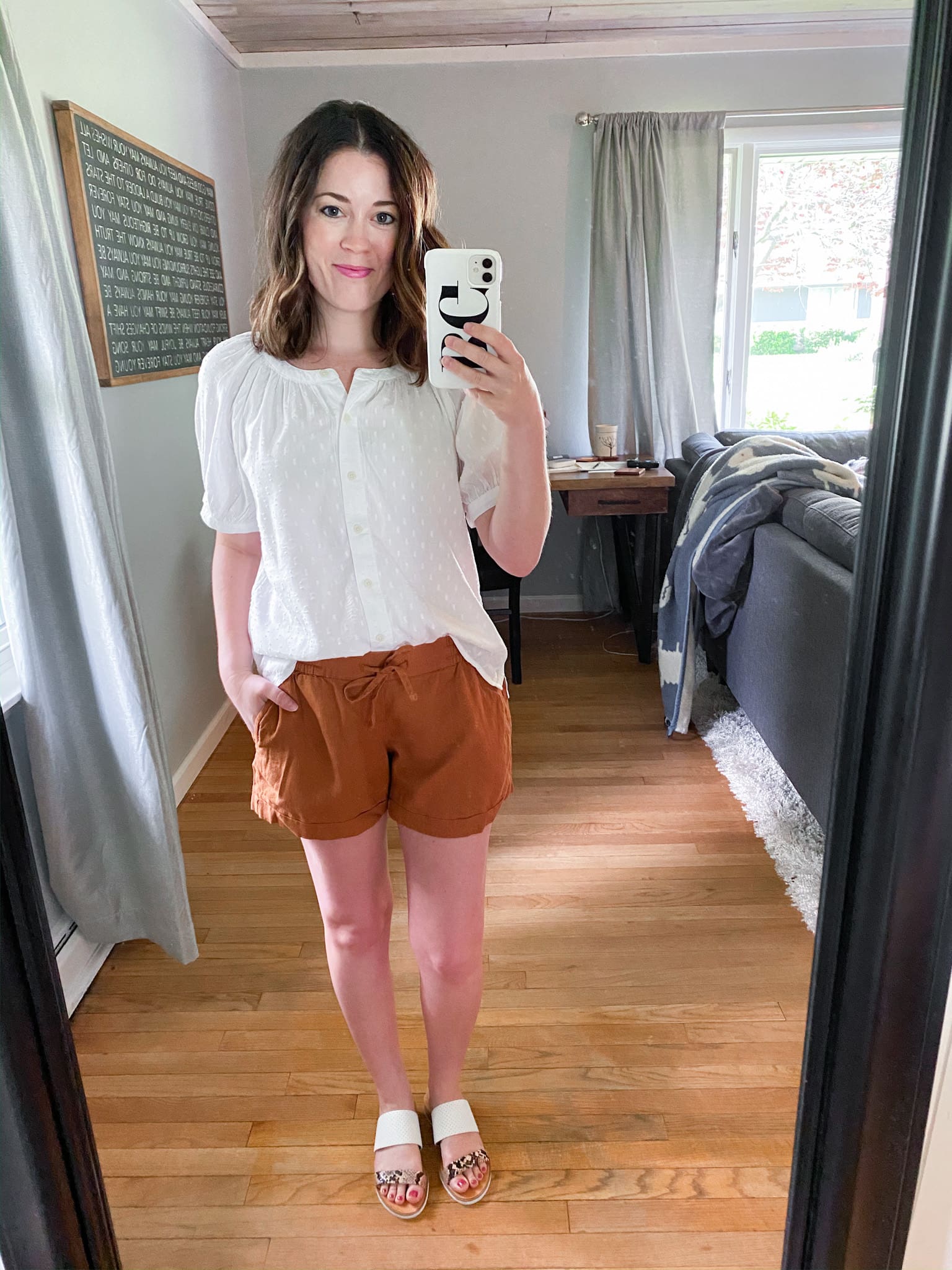 Here is the perfect Zoom-ready WFH outfit for summer! This top is lightweight, soft and comfortable while giving off the professional vibes needed for a video meeting! I paired it with a pair of pull-on linen shorts for comfort and a cute pair of snakeskin sandals to bring it all together!