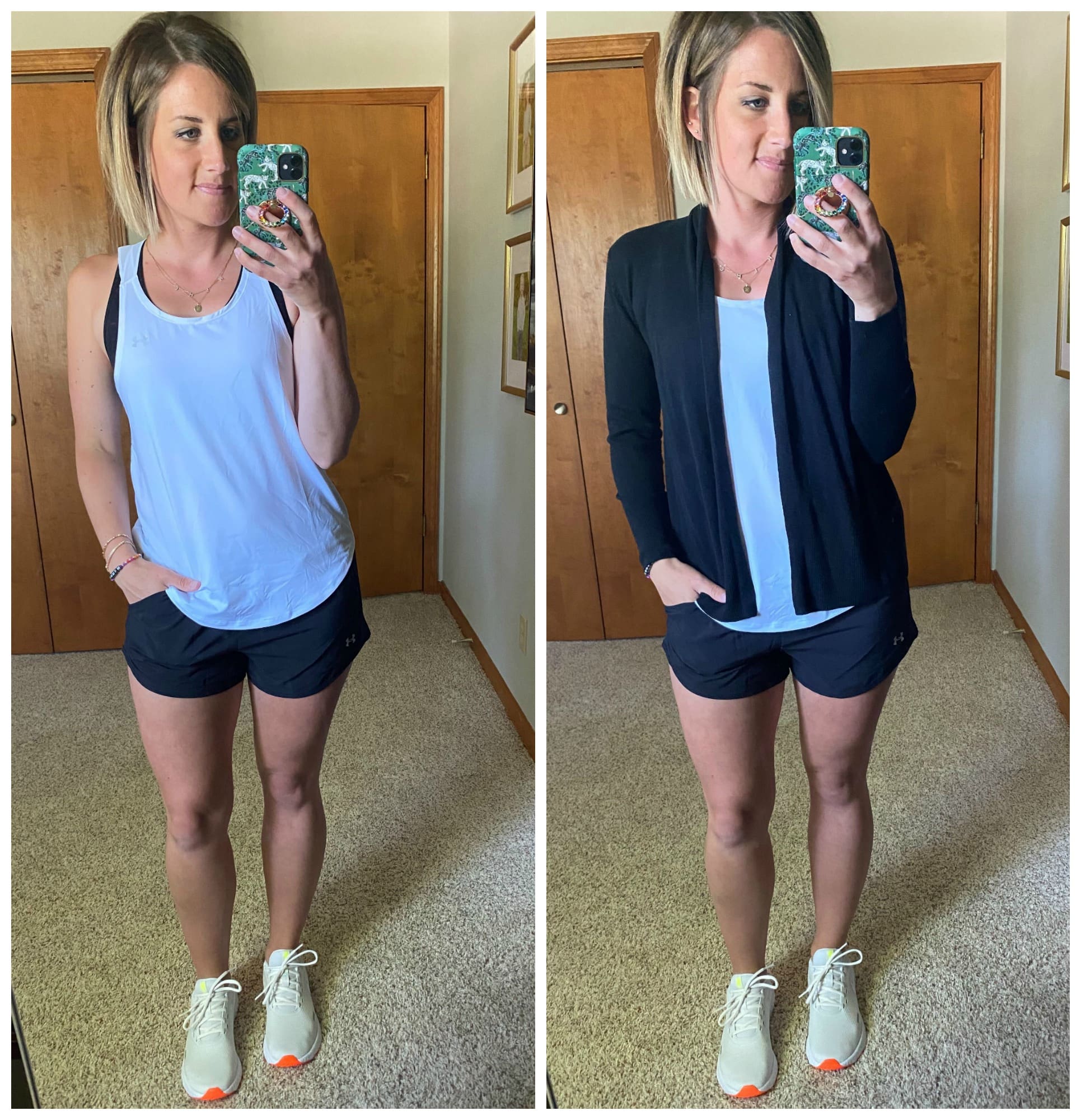 My Summer outfits are drastically different than what I normally wear throughout the year lol We are outside A LOT as a family during the Summer [walks, playing outside, swimming, bike rides, etc..] and my daily outfits tend to be much more comfortable and casual so I can play with my kids while also getting work done! Athletic wear is a personal favorite because it’s comfortable enough to be outside in and can be paired with a cardigan to look more put together for work calls! This tank has the cutest strappy back detail and these shorts have POCKETS which is a gamechanger and I can’t forget about these sneakers that are so bright and fun!