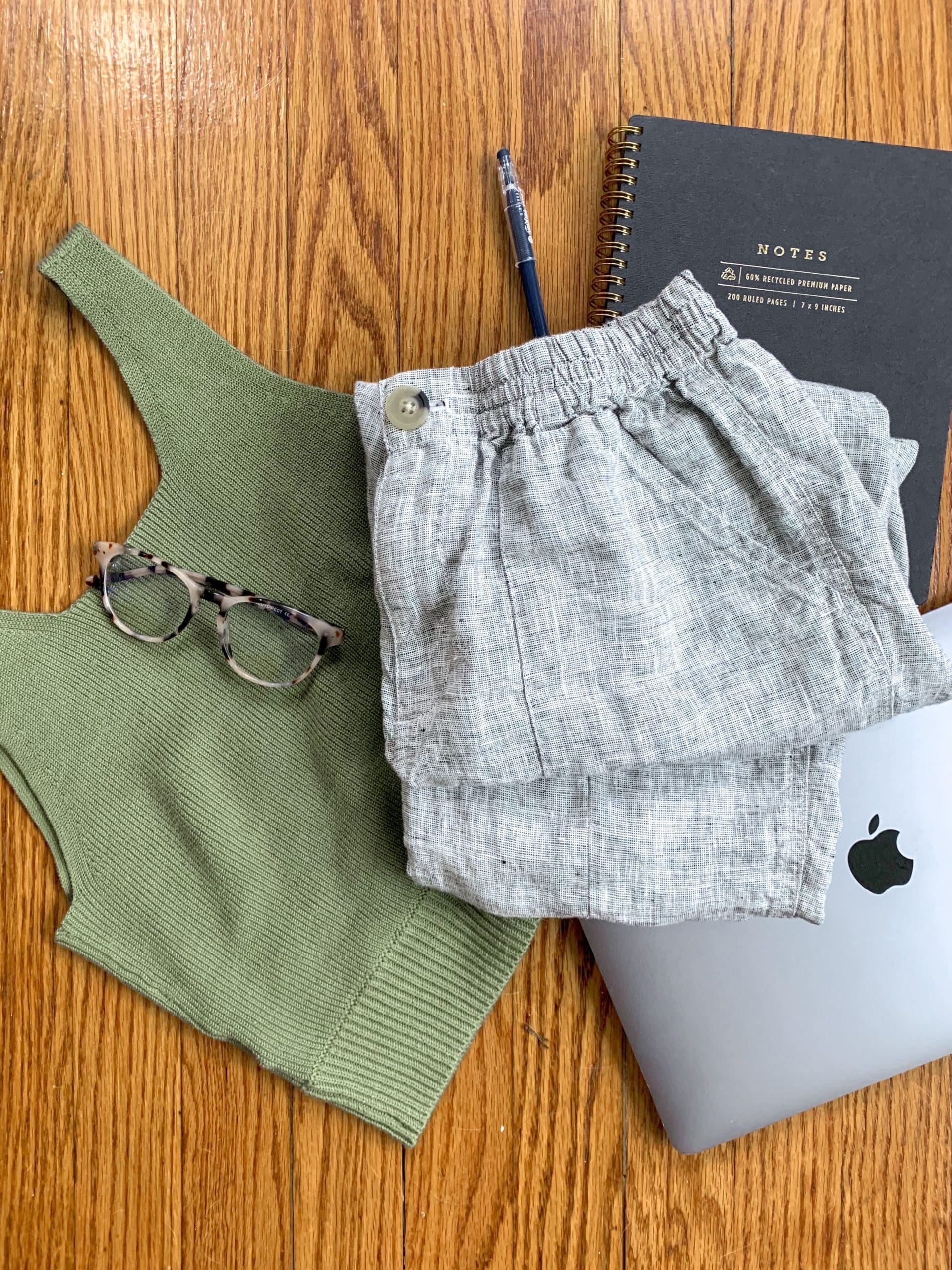 You know it’s a comfortable work from home outfit when the top is actually meant to sleep in. Jokes on your fellow Zoom-mates. I love this short sleeve sweatshirt that yes, could be worn to bed but better yet, as you take on your daily to-do list. I think it pairs perfectly with denim shorts or a comfy pair of linen shorts like I’m wearing here!