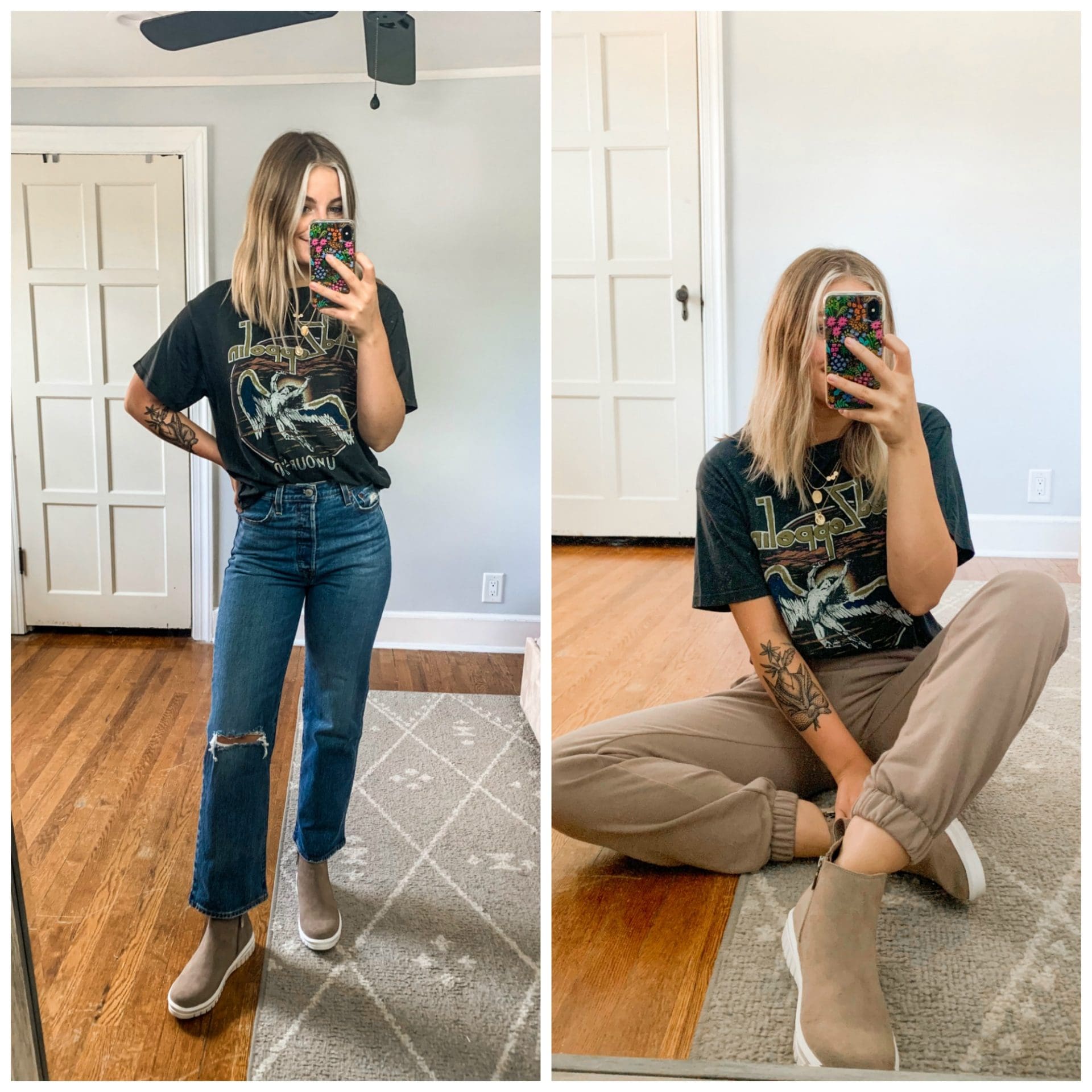 Daydreamer Band Tee [TTS, wearing size XS] // Levi Cropped Flare Jeans [Size down if in between] // Circlex Joggers [TTS, wearing size XS] // Blondo Waterproof Booties [TTS, wearing size XS]