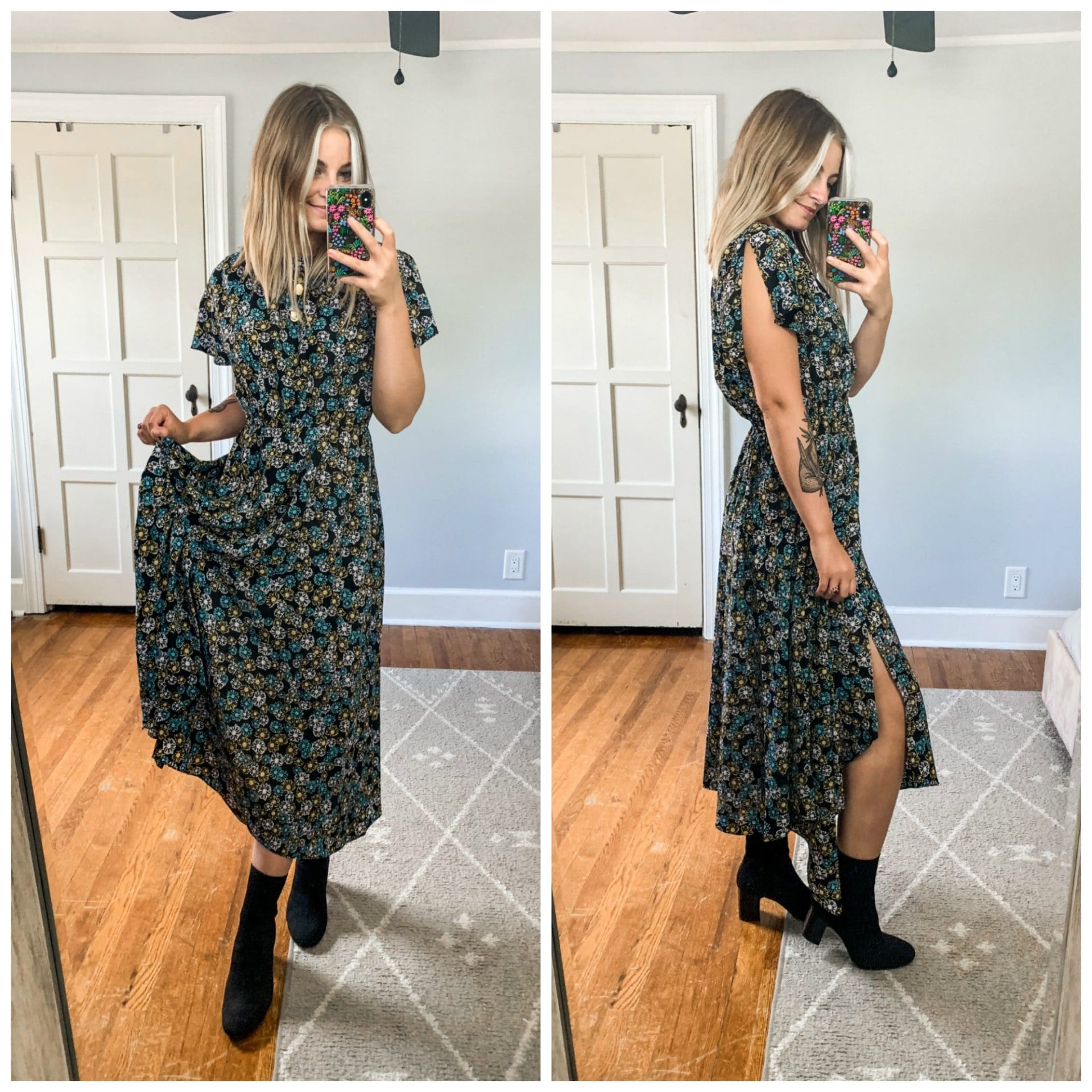 Topshop Floral Printed Midi Dress [TTS, wearing size US 0-2] // Madewell Three Layer Necklace // Born Meggs Sock Booties [TTS, wearing size 8]