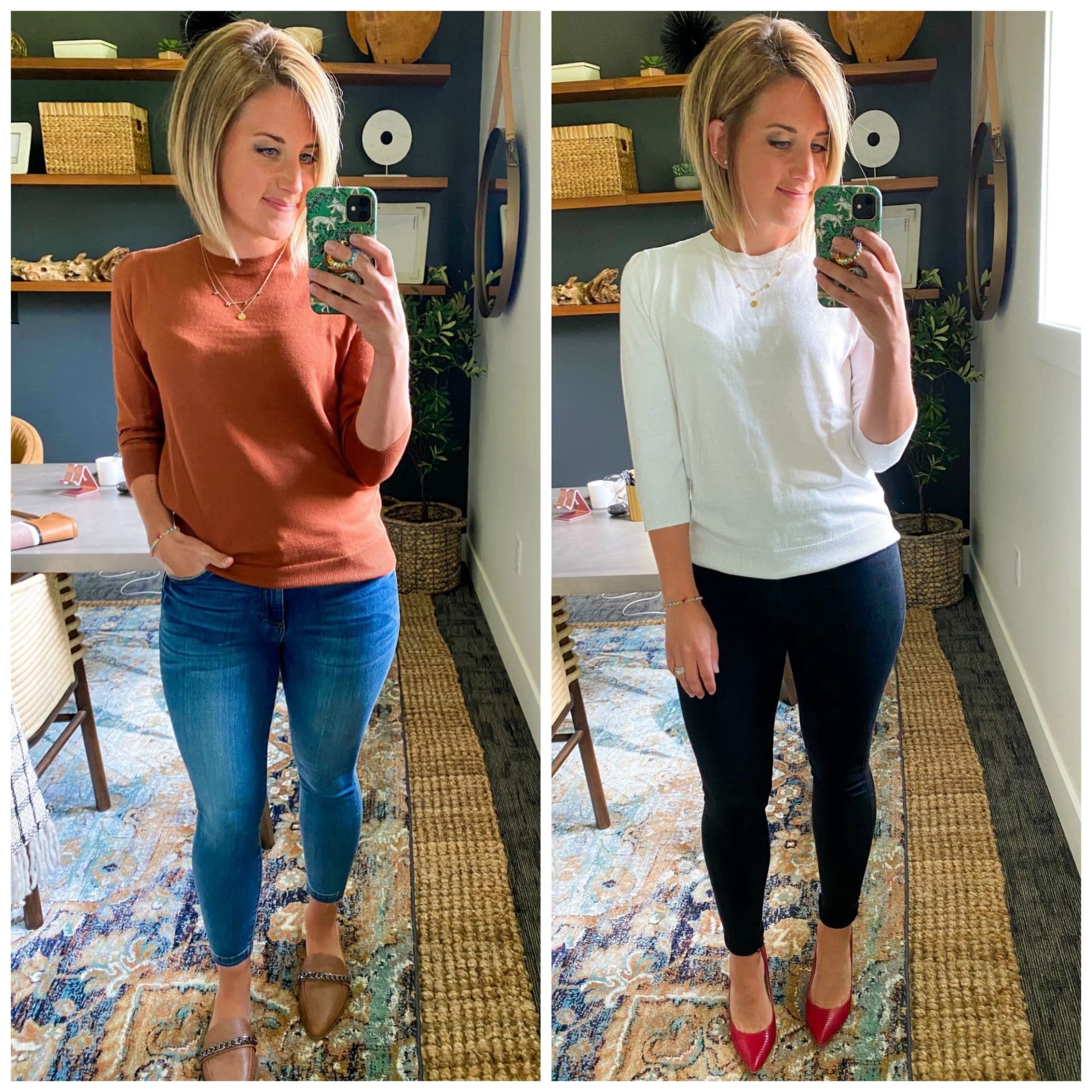 I could not take a photo of this sweater that does it justice to save my life, but I PROMISE it is magical! Flowy, cozy, perfect for jeans or leggings from Fall to Spring! I’d say it’s an elevated basic – my favorite type of piece! It’s got a few fun details like stitching along the top and bishop sleeves, but nothing too extreme. Right up on there on the list of things I’m loving from the Sale are these Ab-Solution High Waist Crop Jeans. As a long time fan of the colored Ab-Solution pants, I had to try these on for size! Ding, ding, ding, they’re also a winner!