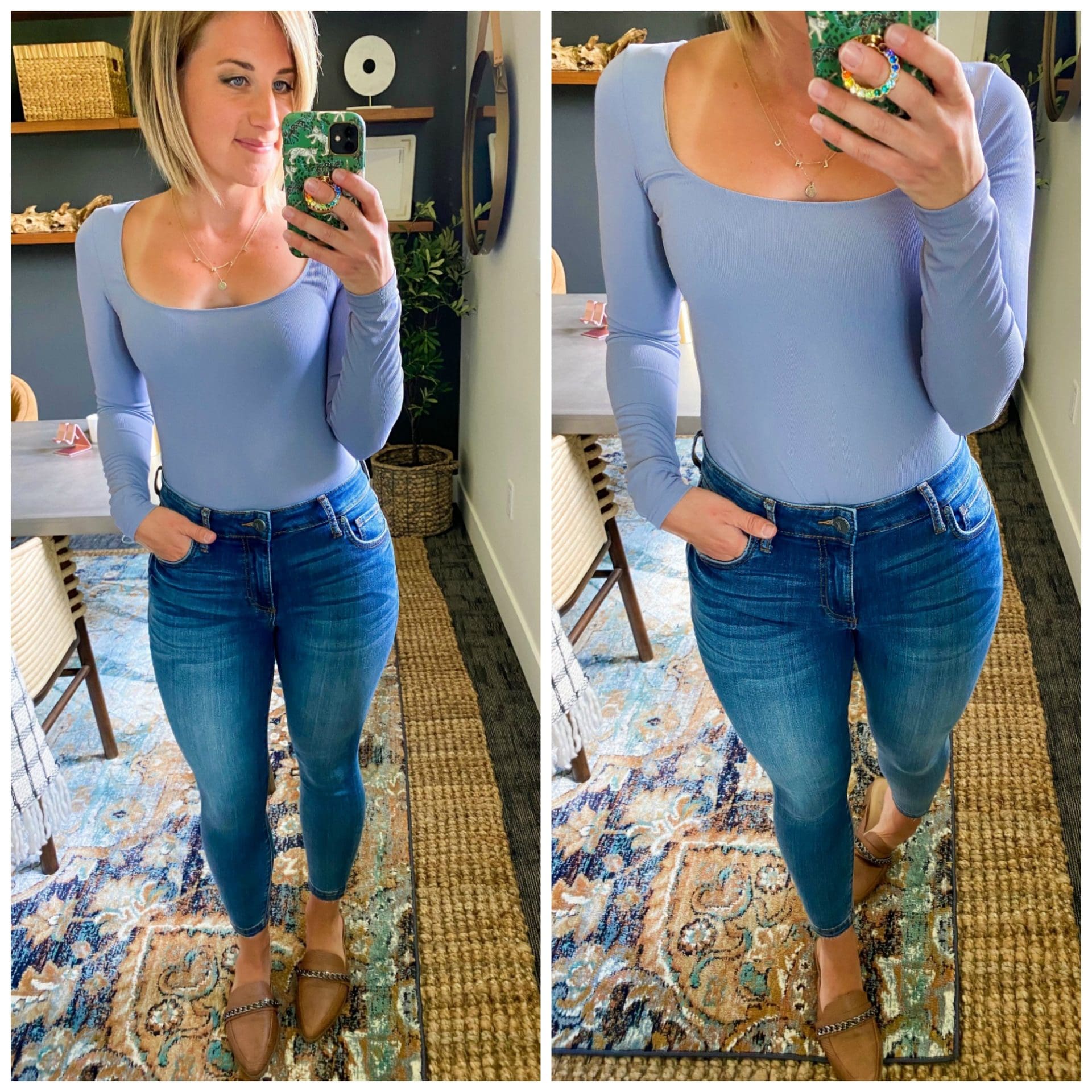 Waffle knit tunics are my jam in the fall, so I decided to add this one to my closet this year! It’s legging friendly with full booty coverage. It does run large– I’m normally a size medium, wearing a small here, but could have done an XS. So size down at least one! Side note to self: check inseam before ordering. While these jeans were super flattering [LOVE the high-rise], they have a 30″ inseam that just wasn’t working for my 5’5″ self. Ladies with longer legs; these might be a great option for you! Unfortunately for me, back they go.