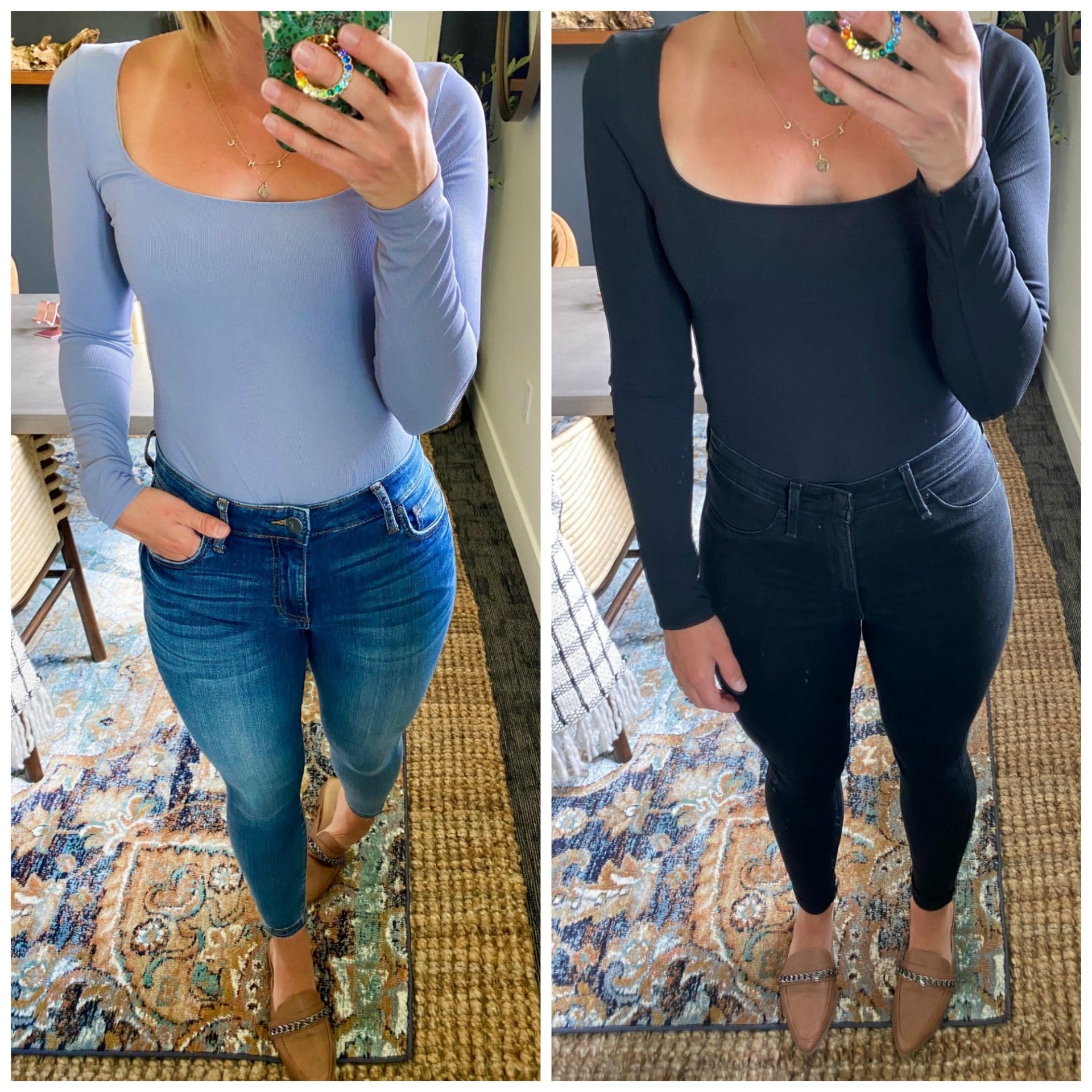 I am all about the tuck these days and I love that I can wear this bodysuit under pants and skirts without the bulk that tucking a shirt can create. I love the subtle rounded square neckline and that this classic look can be paired with so much in my closet — I know this is an instant closet staple! I will say that it is a bit on the lower side of my comfort zone when it comes to necklines, so if you’re wary about that, this might not be for you!