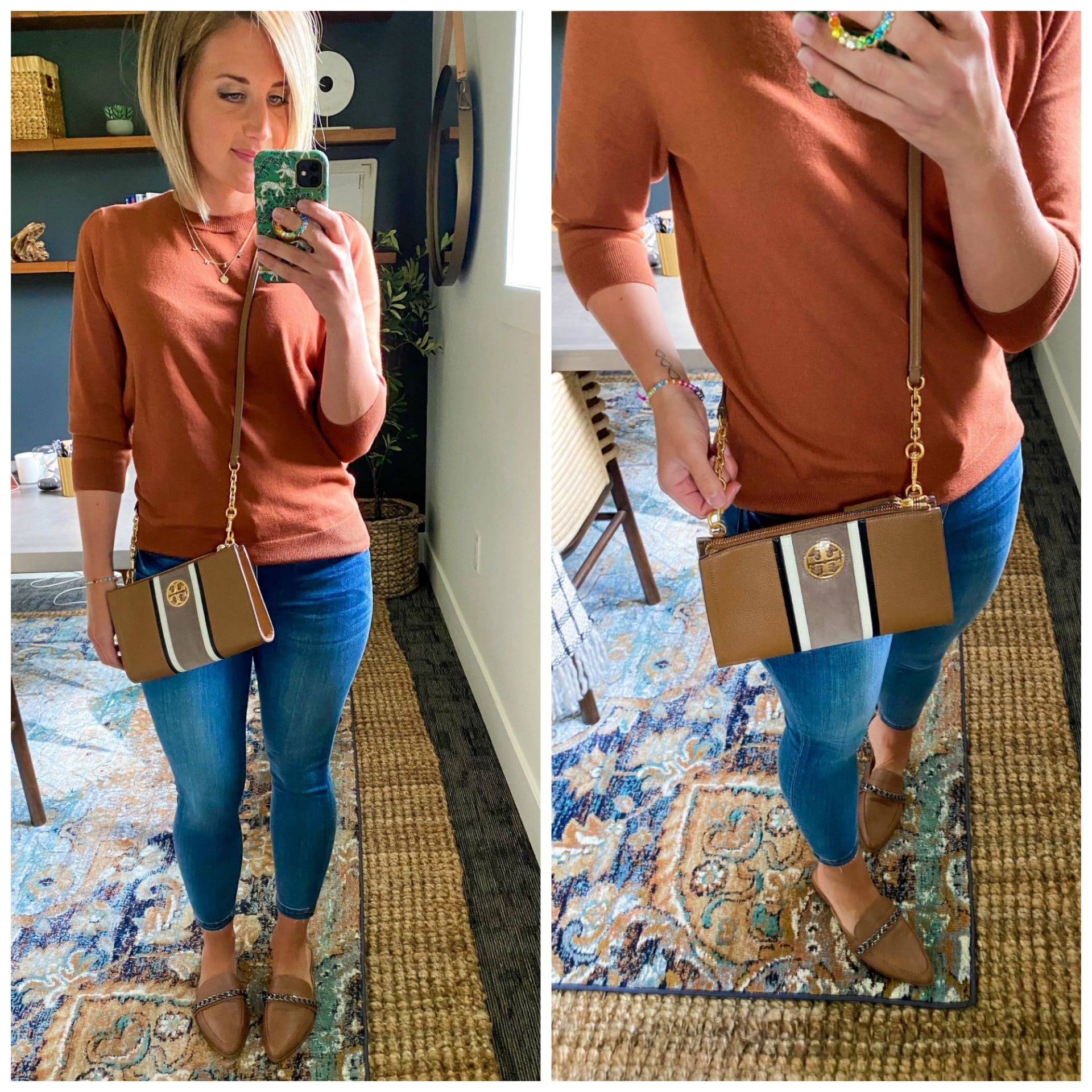 Tory Burch Carson Stripe Crossbody // Sweater [Size down, wearing in XS] // Jeans [size down one, wearing in 2petite] // Mules [TTS]