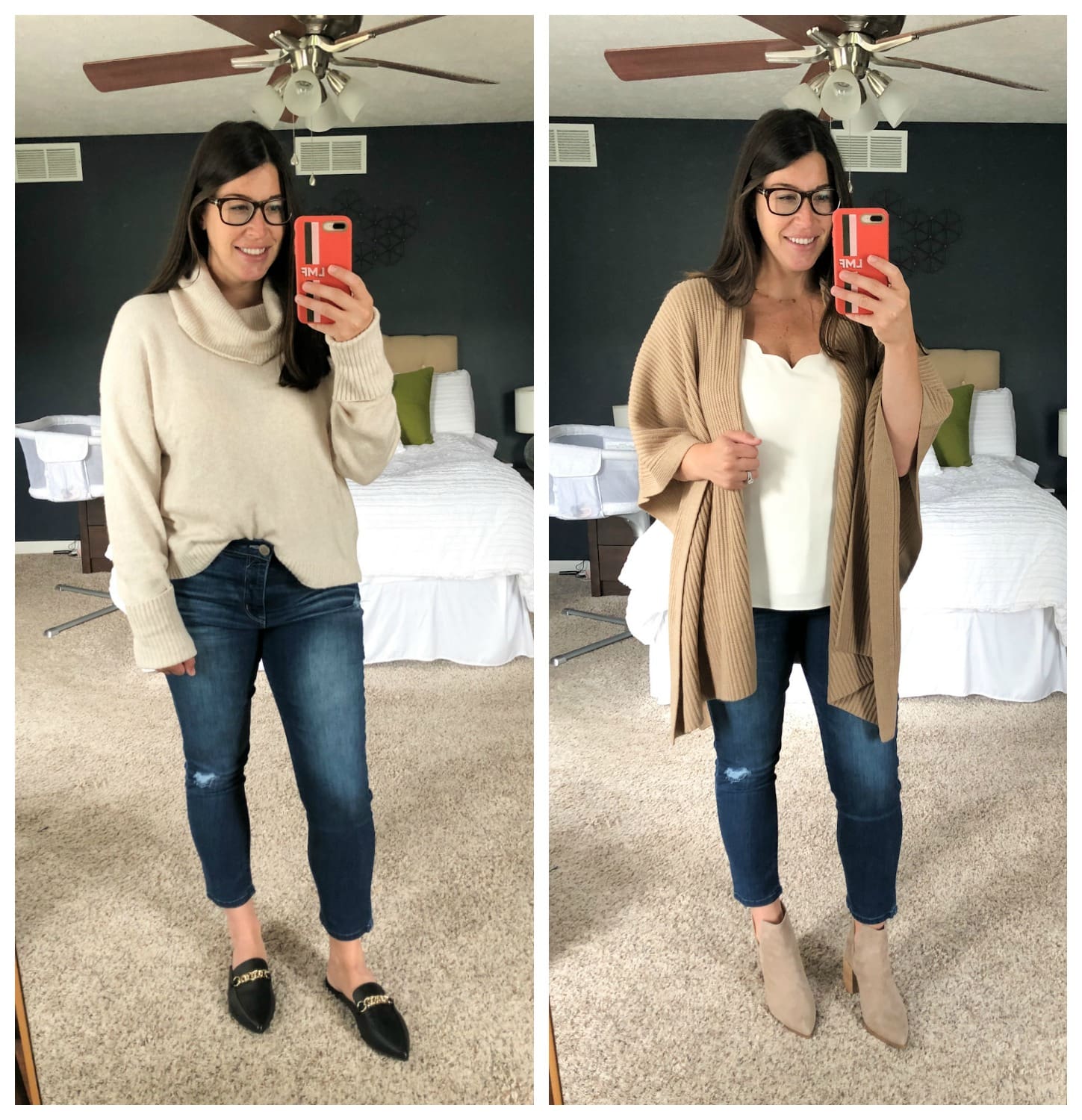 Jeans [size down at least one!] // Cowl Neck Sweater [tts] // Wrap // Similar Wrap // Flats [size up .5] // Booties [size up .5]