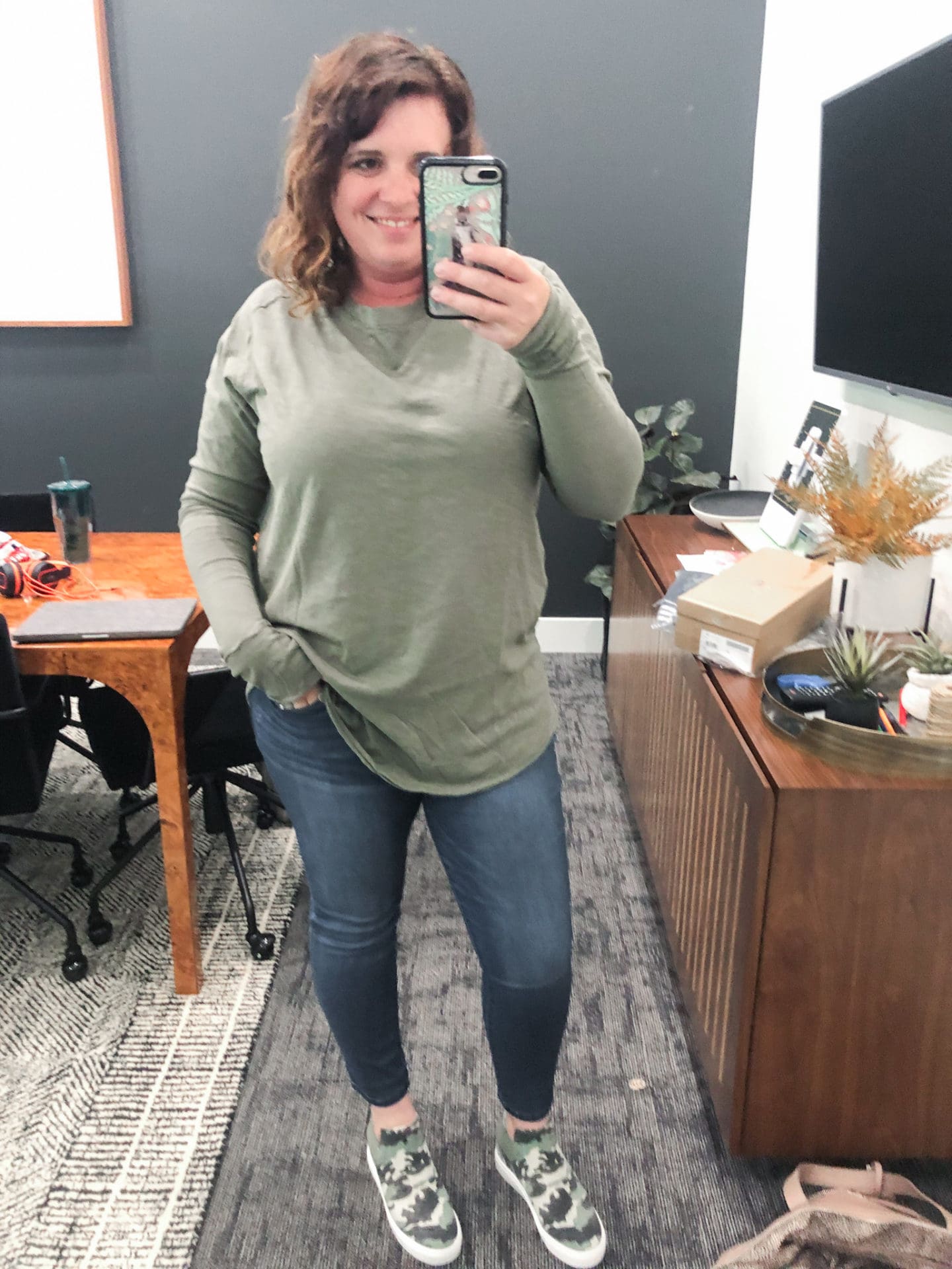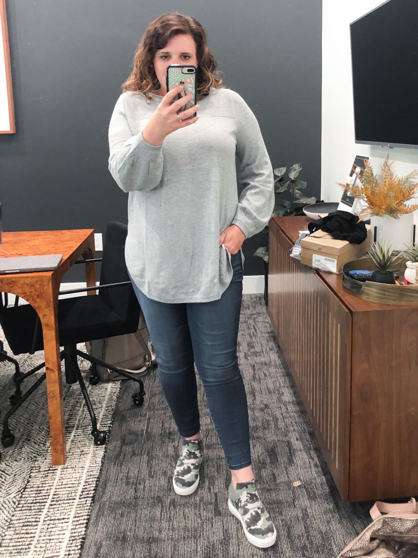 Catherine Distressed Boyfriend Jeans [TTS, wearing in 10P] // Steve Madden Crushin High Top Slip-On Sneaker [TTS, wearing in Green Camo] // Caslon Bishop Sleeve Sweater [Size down if between, wearing in M in Grey Heather]