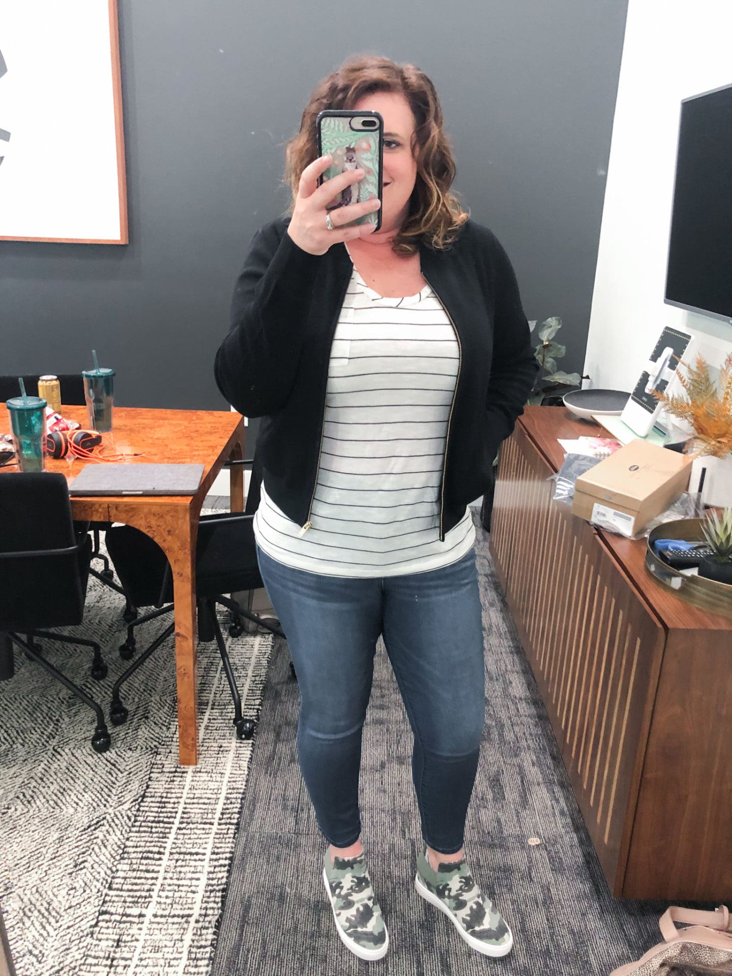 J.Crew Sweater Bomber Jacket [Size up if larger chested, wearing in M] // Caslon Rounded V-Neck Tee Shirt [Size up if bigger chested, wearing in M] // Wit & Wisdom Ab-Solution High Waist Crop Jeans [TTS, wearing in 10P] // Steve Madden Crushin High Top Slip-On Sneaker [TTS, wearing in Green Camo]