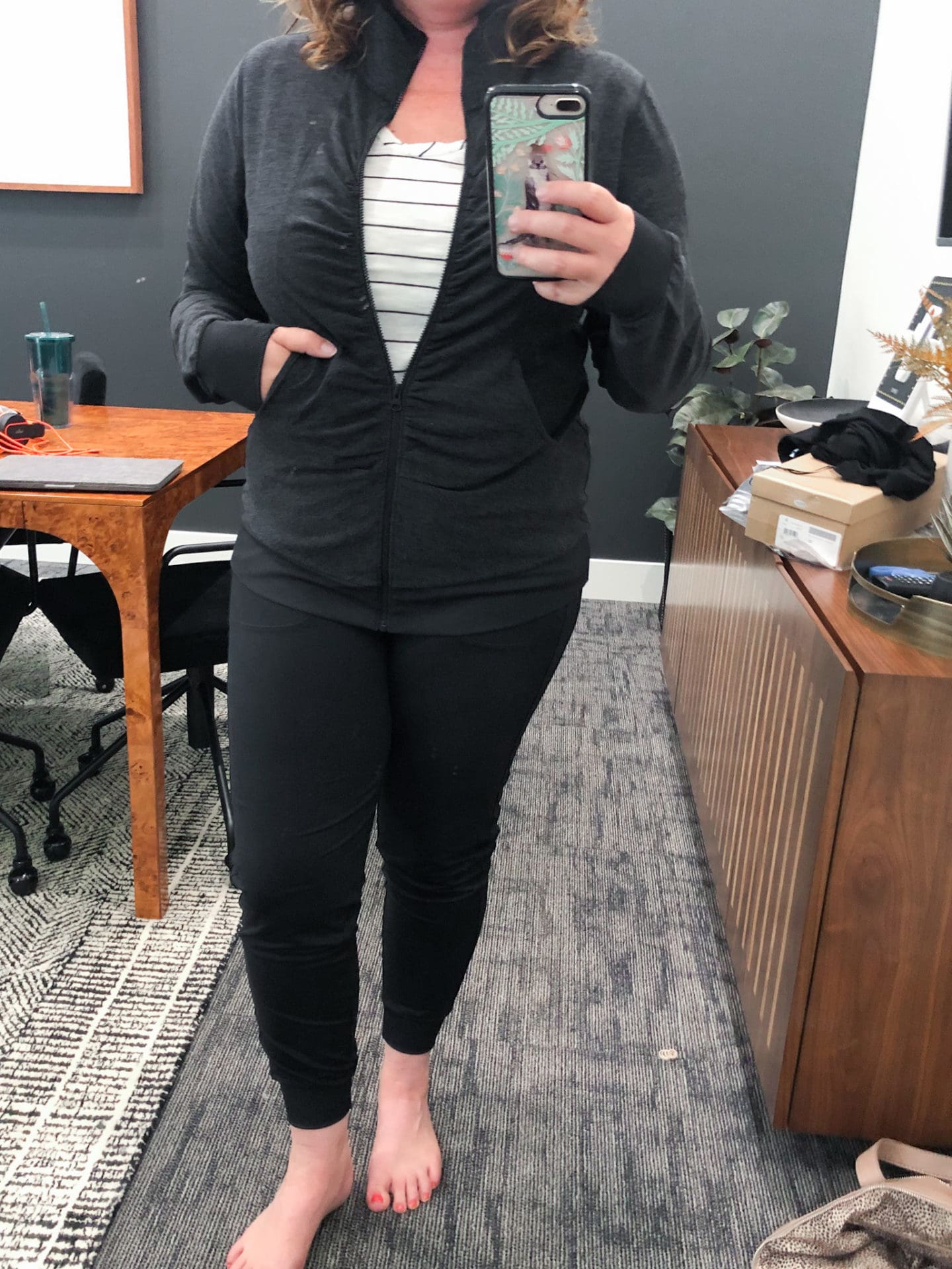 Zella Live in Joggers [TTS, wearing in M] // Zella Lola Soft Cozy Jacket [TTS, wearing in L] // Caslon Rounded V-Neck Tee Shirt [Size up if bigger chested, wearing in M]