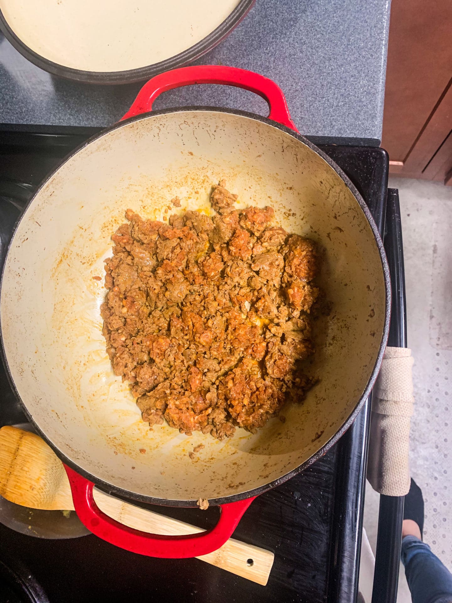 3. In a dutch oven or large pan, add 2 Tablespoons of olive oil to pan and cook the meat on medium-high until thoroughly cooked (usually approx. 10 minutes)