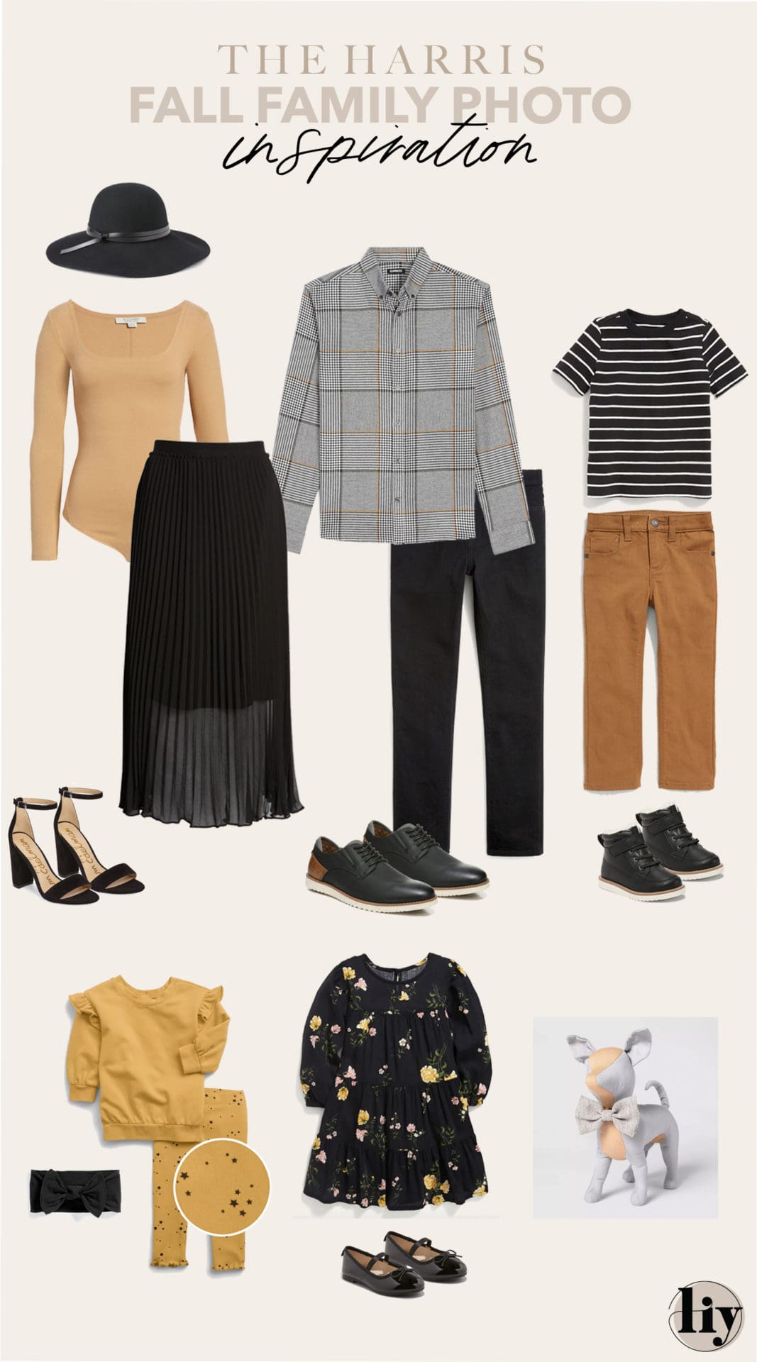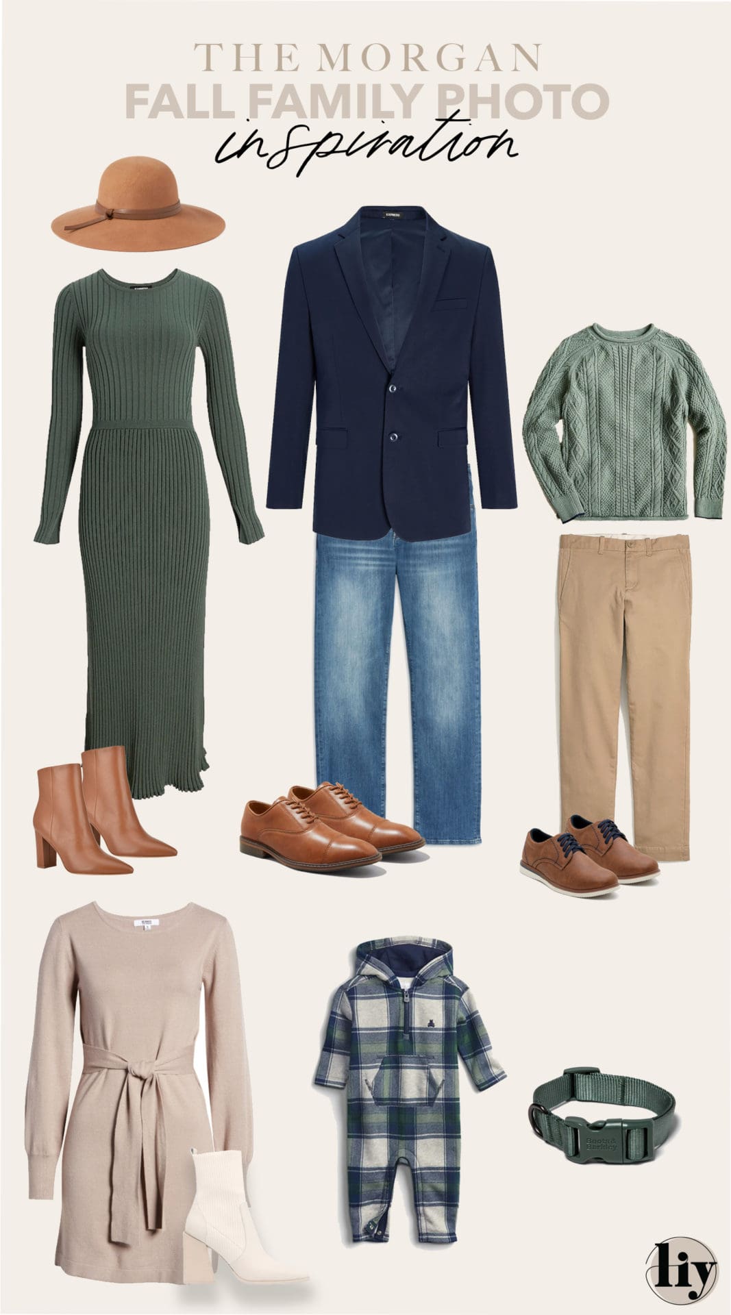 Her: Hat / Dress / Booties Him: Blazer / Pants / Shoes. Boy: Sweater / Pants / Shoes. Girl: Dress / Booties Baby: One piece. Dog: Collar