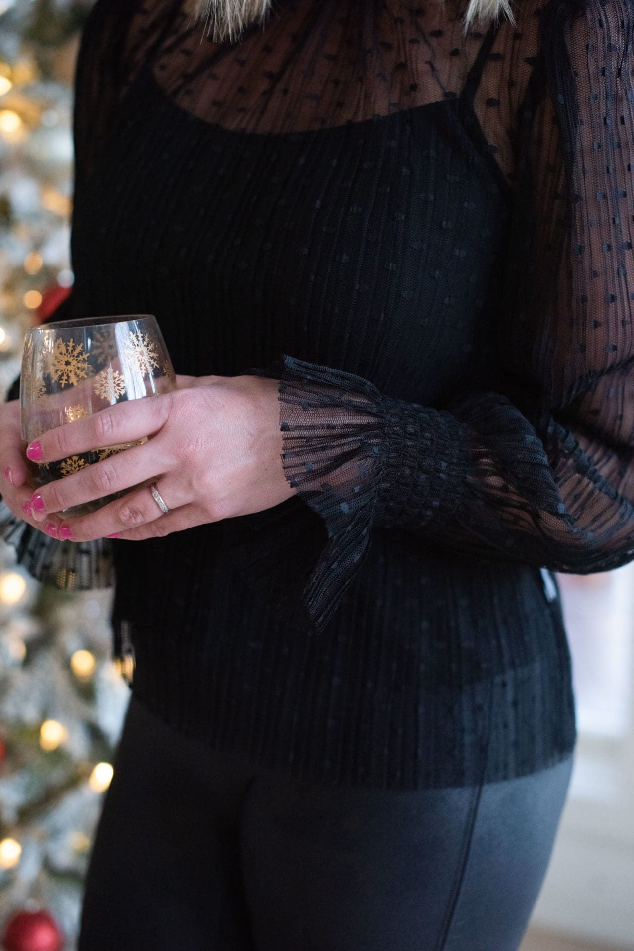 Point d’Esprit Mock Neck Top • 1 STATE [true to size, wearing in small] // Faux Leather Leggings size up if in between, wearing in small // Tassel Drop Earrings • BaubleBar