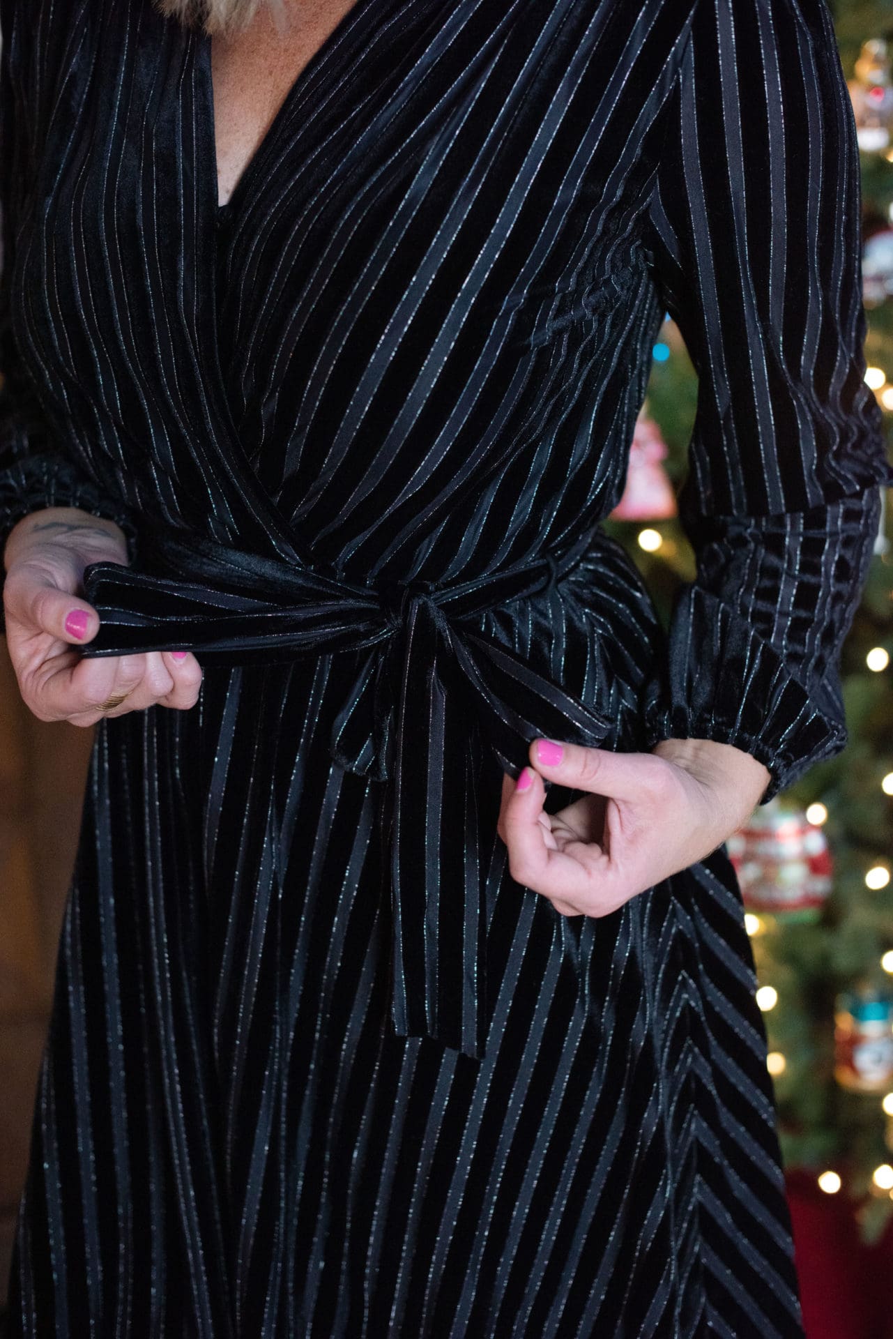 Metallic Velvet Tie Waist Long Sleeve Dress • Fraiche by J [true to size, wearing in small] // Yaro Ankle Strap Sandal • Sam Edelman [true to size]