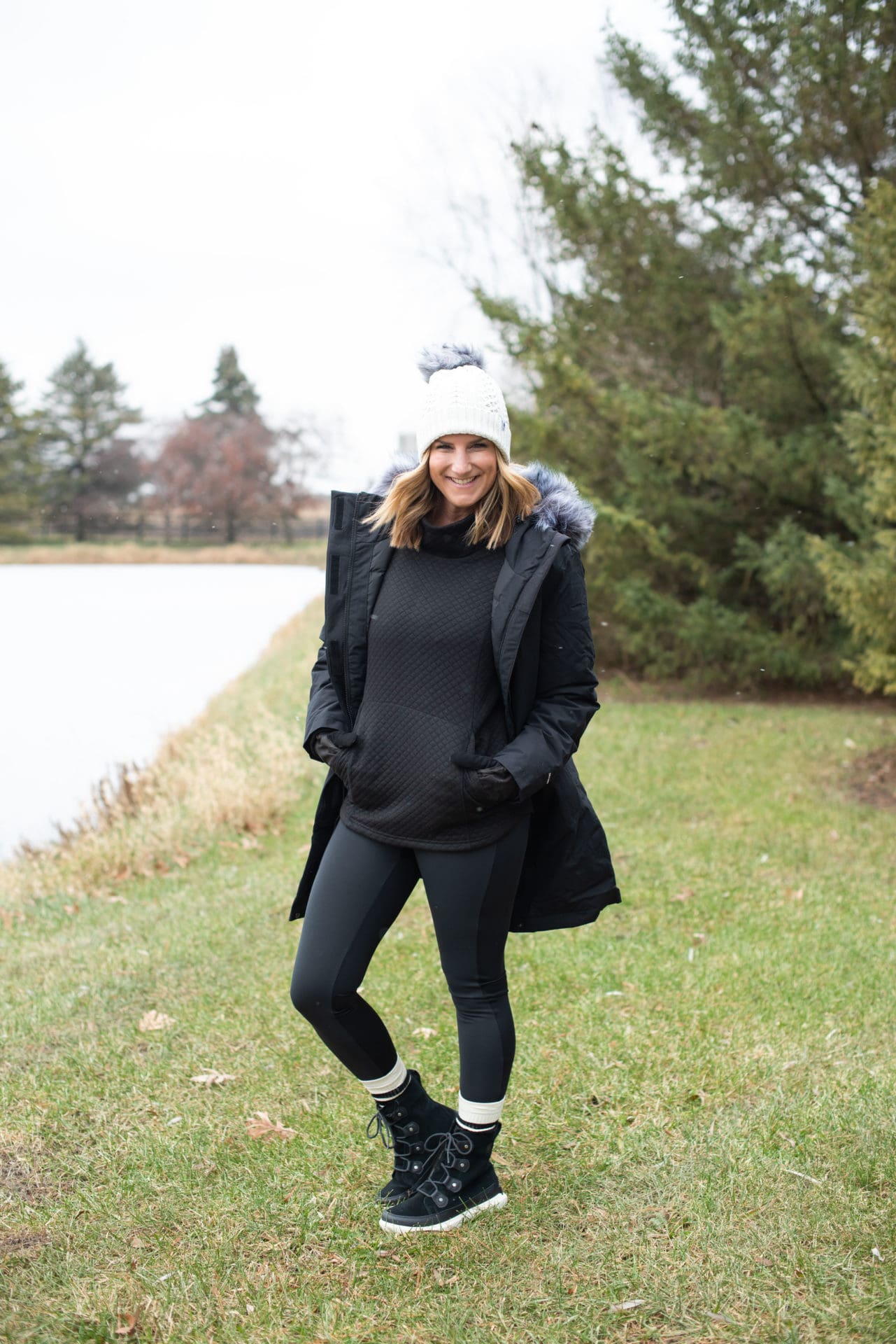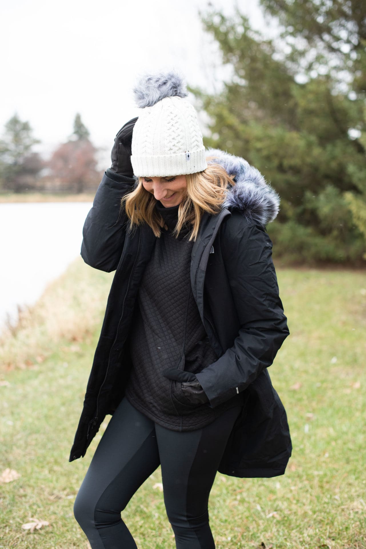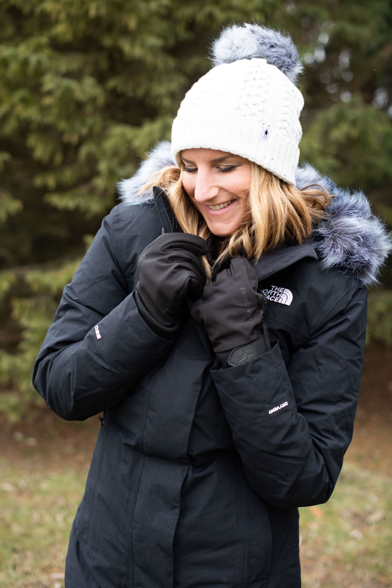 The North Face Arctic Down Parka [true to size, wearing small] // Stoic Quilted Cowl Neck Pullover [true to size, wearing small] // Backcountry Frary Fleece Tight [true to size, wearing small] // Smartwool Lodge Girl Beanie // Stance Gauge Sock – 3-Pack [similar] // Sorel Explorer II Joan Faux Fur Boot [true to size] // SealSkinz Waterproof All Weather Insulated Glove [true to size, wearing small]