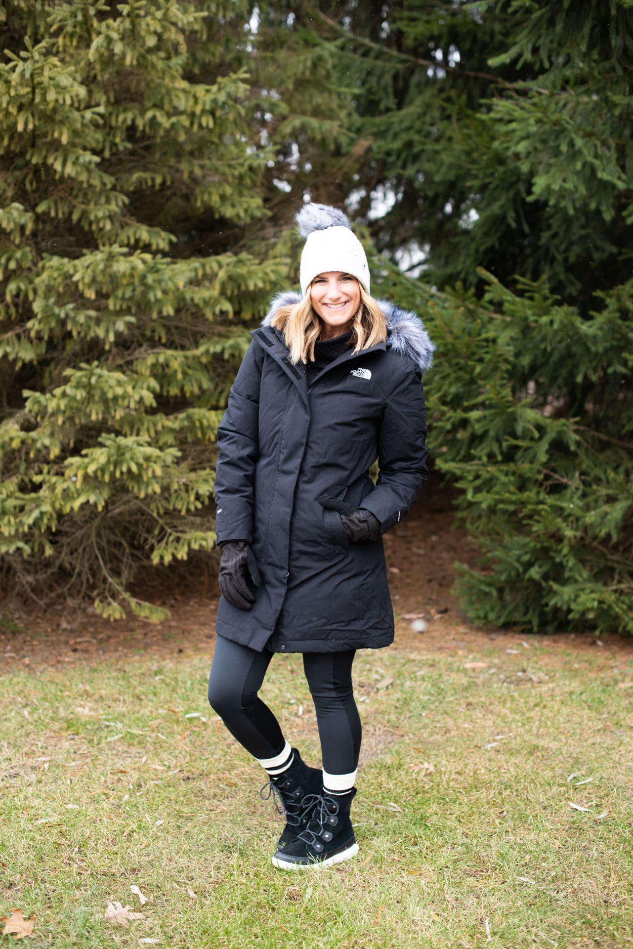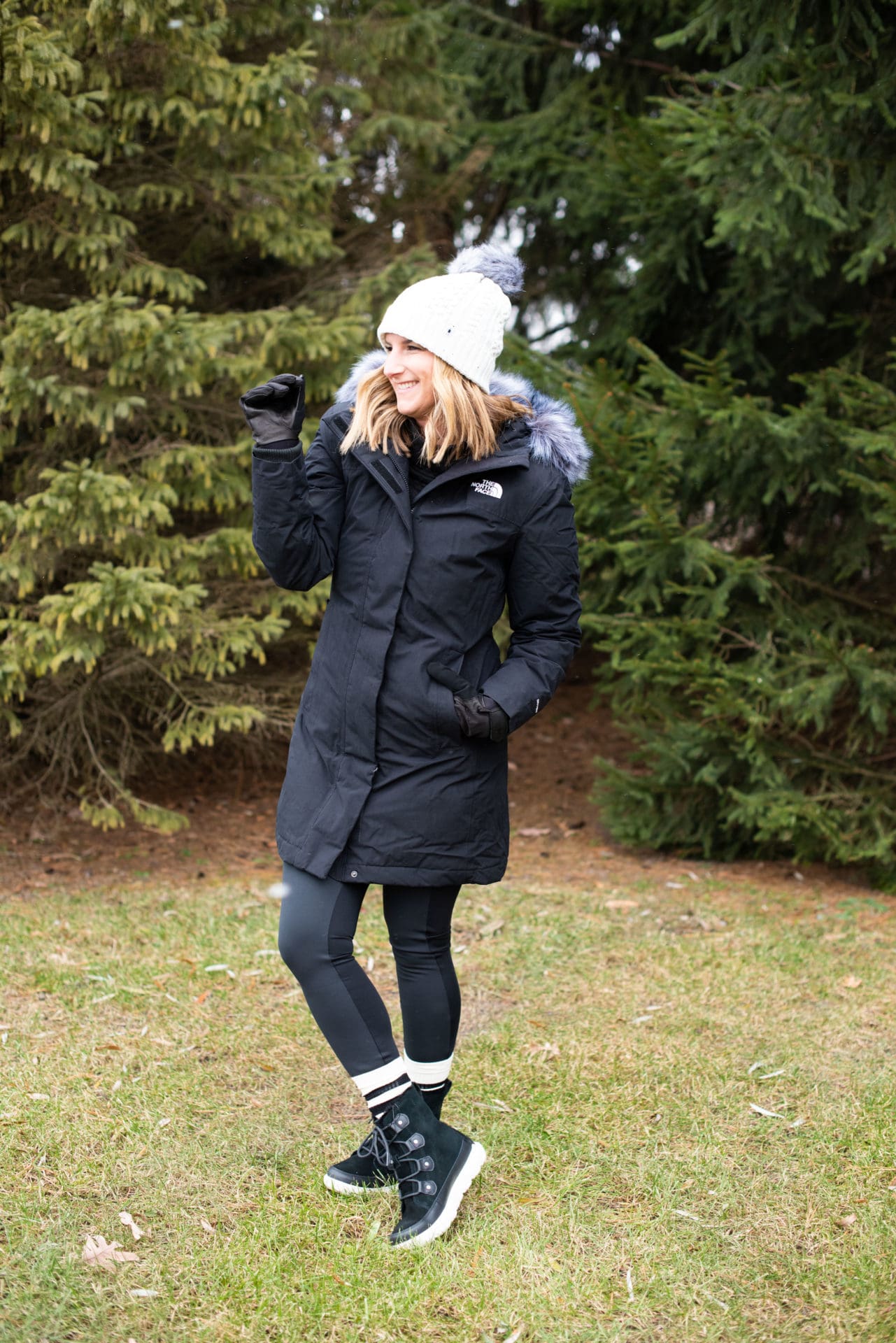 The North Face Arctic Down Parka [true to size, wearing small] // Backcountry Frary Fleece Tight [true to size, wearing small] // Smartwool Lodge Girl Beanie // Stance Gauge Sock – 3-Pack [similar] // Sorel Explorer II Joan Faux Fur Boot [true to size] // SealSkinz Waterproof All Weather Insulated Glove [true to size, wearing small]