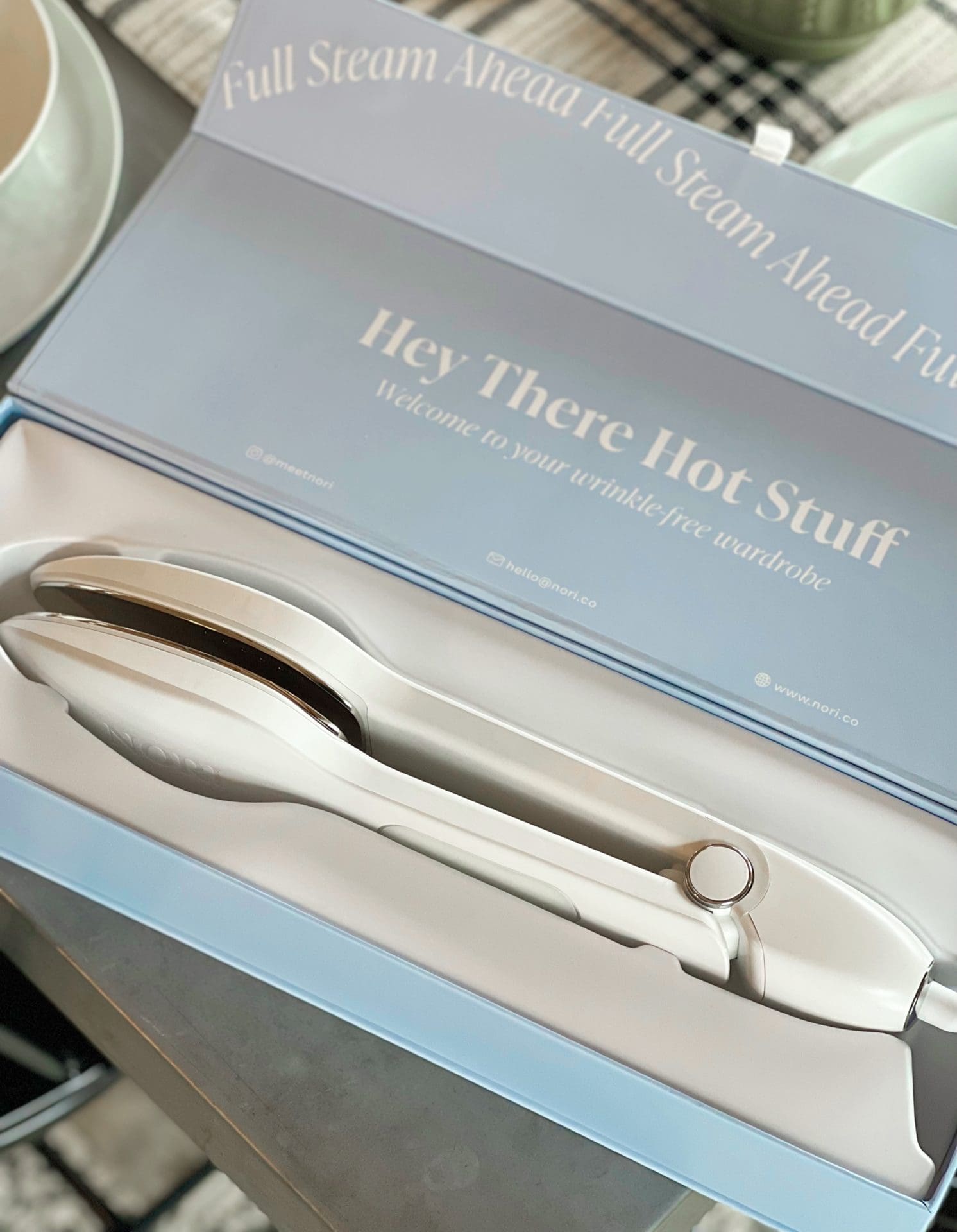 I got sucked in by an Instagram ad [again. I swear they always know exactly how to lure me in with products I didn’t know I “NEED” and then BAM, outta nowhere I’m spending hundreds of dollars on some tool that will 100% make my life better…or will it?] Well, that’s what happened to me when all of a sudden I was watching a video about The Nori Press, the iron + steamer that looks like an oversized hair straightener! I watched in amazement that you could just press your clothes [both the front and back of a shirt] at once and gently swipe to take all wrinkles away. I was also intrigued by the 1.4 pound weight knowing I could easily pack this for future vacations.