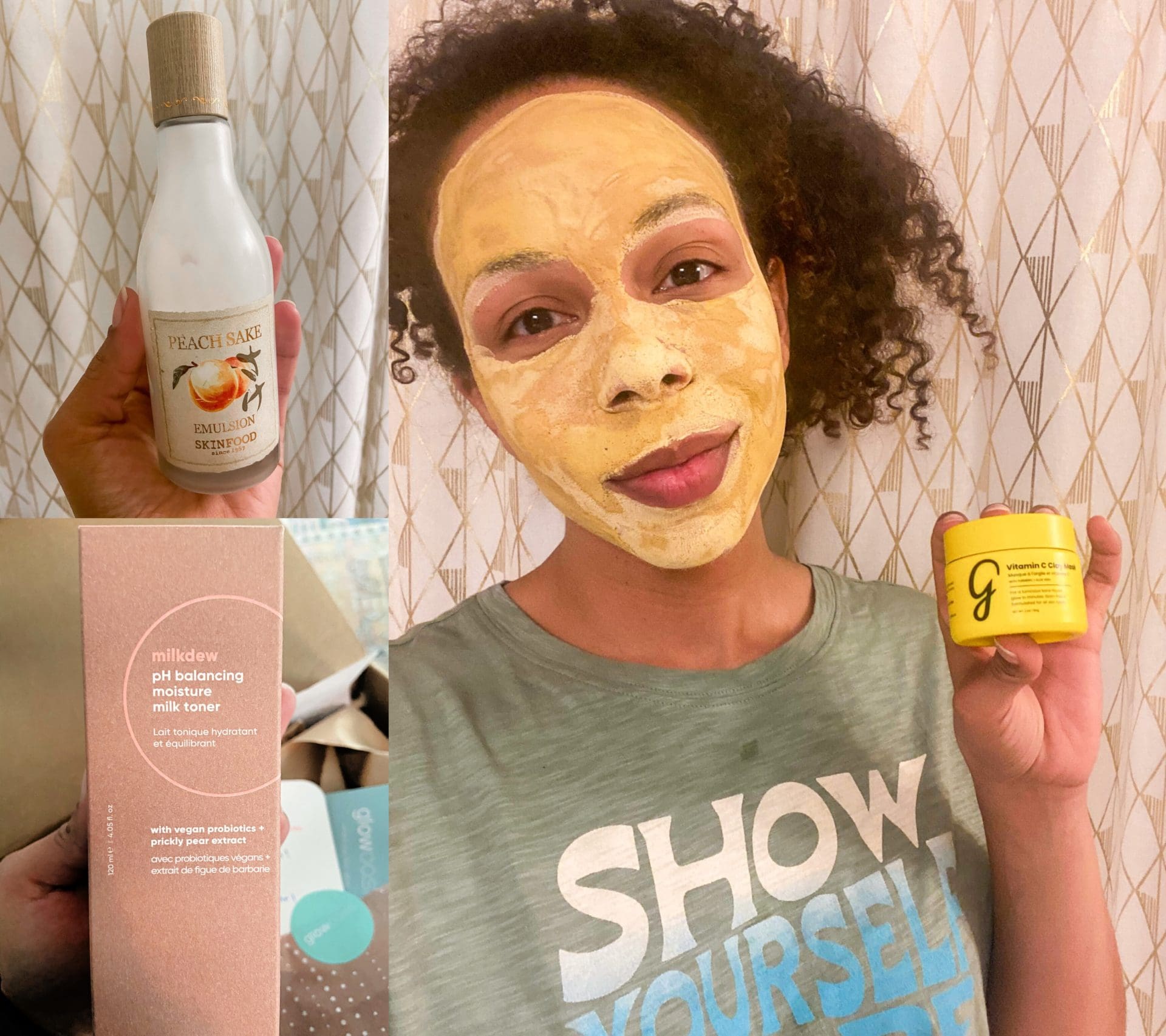 glowoasis milkdew pH balancing moisture milk toner // Gleamin Vitamin C Clay Mask // Skinfood Peach Sake Emulsion