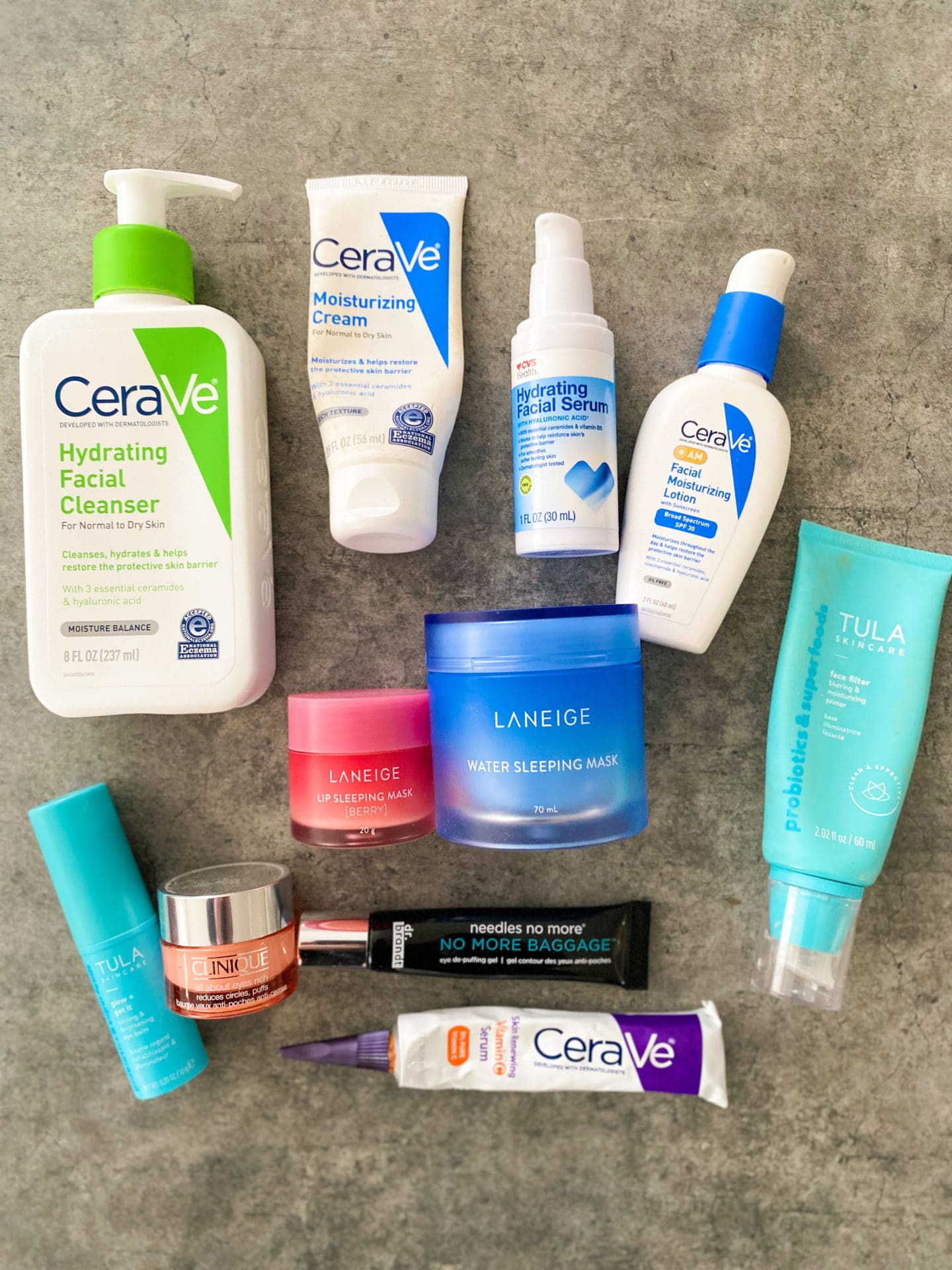 Some women have dry skin, some have oily skin – I’m lucky enough to have both. 😉 If you too have combination skin, I’ve have great luck with CeraVe skincare products. I love that they’re available at the drugstore and don’t break the bank. I’ve tried more expensive products [like Drunk Elephant] and broke out horribly. So for now, CeraVe it is! In the drier winter months, I prefer the hydrating facial cleanser and in the summer [when I tend to be more oily] I reach for the Foaming Cleanser meant for normal to oily skin. Sun protection is sooo important, so I also recommend the AM daily moisturizer with SPF 30. On days I opt out of wearing makeup, I reach for the Tula Face Filter primer [with a subtle tinted glow!] and a dollop of under eye cream!