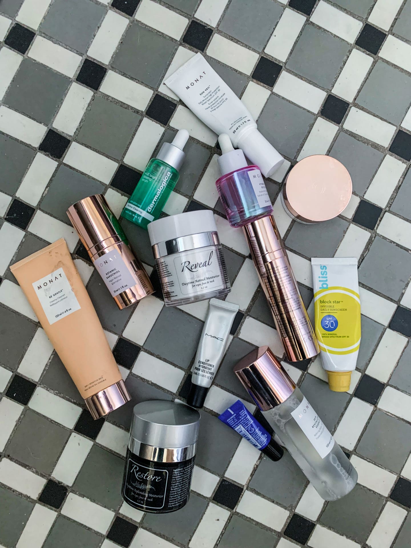 MONAT Rewind Age Control Nectar // MONAT Skin Revitalizing Essence // MONAT Be Gentle Creamy Cleanser // MONAT Eye Smooth Eye Cream // MONAT Botanic Bakuchiol // MONAT Hydration Booster Serum // MONAT Sun Veil Sunscreen // Bliss Sunscreen