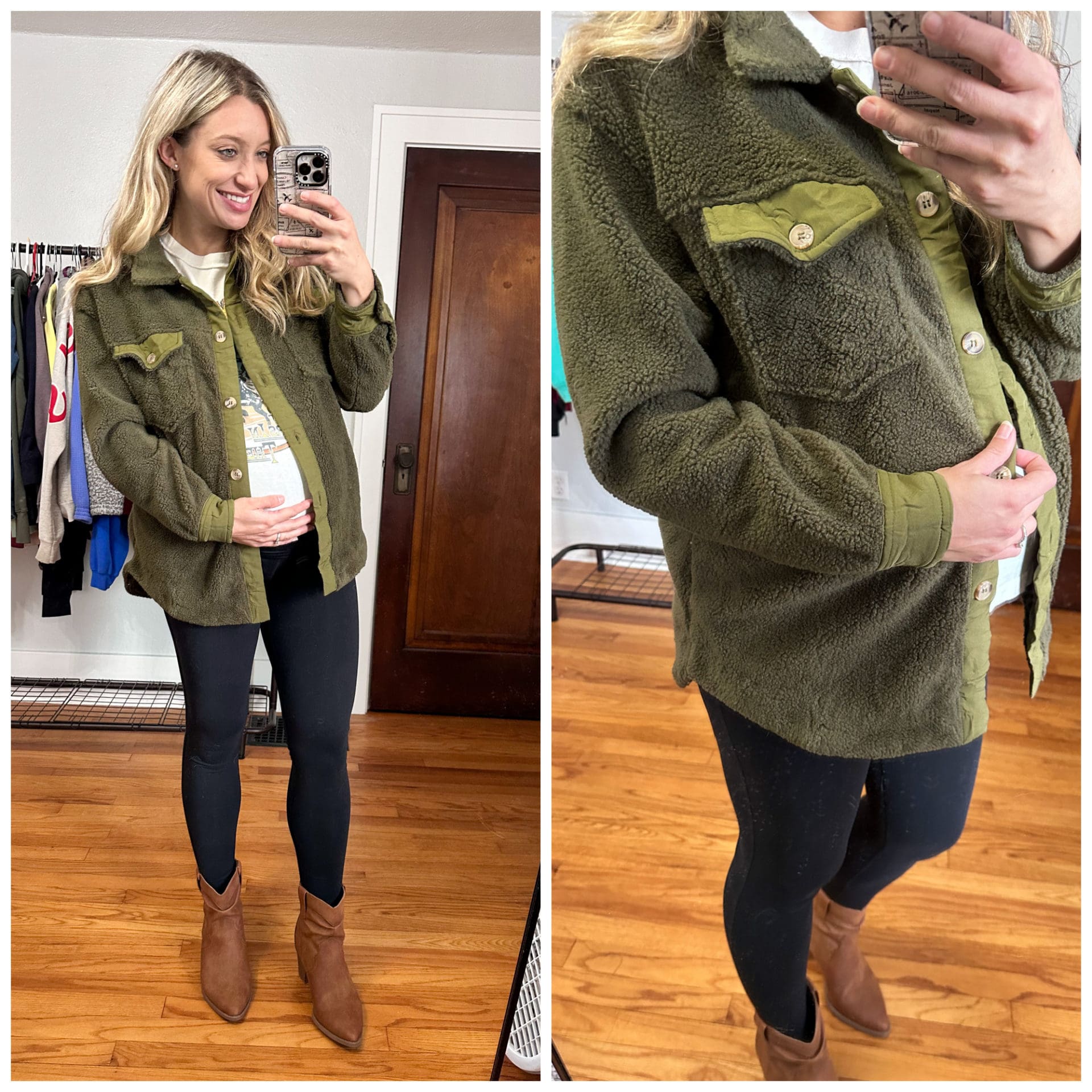 Shacket [true to size for oversized fit] // Graphic Tee [size up if in between] // Maternity Leggings [true to size] // Booties [true to size]