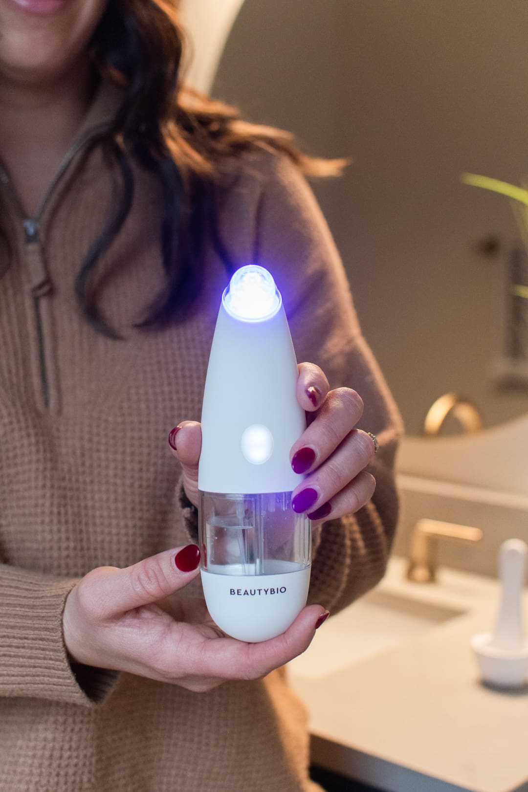 I’d like to introduce you to my new BFF, and the reason I’m saying goodbye to spa facials — the BeautyBio GLOfacial! It simultaneously vacuums out your pores while hydrating the skin and covering the area with a clarifying blue LED light. And friends… I couldn’t love it more! The amount of satisfaction I got seeing the gunk that was pulled from my face was a bit disturbing…. And I’m not ashamed! It’s like power washing, mowing the lawn, and now “vacuuming” my face – tomato, tomato! Things I can’t believe I’m admitting on the internet… ha! After three years of development, this is the first of its kind product on the market, and it’s a game changer for bringing the spa experience to your home! And today is your lucky day…