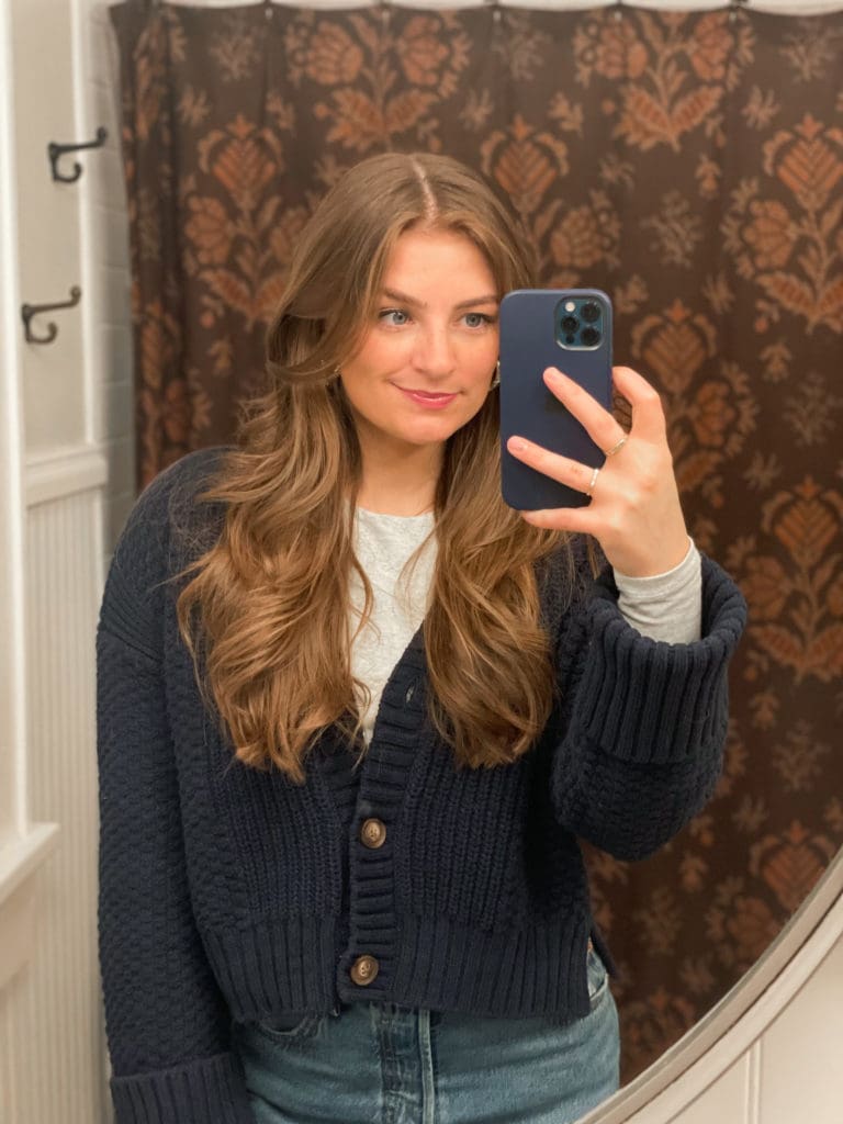 I have been wearing this cardigan on REPEAT! It’s honestly the perfect blend of dressy and casual. I either pair it with high waisted jeans or a silk midi skirt to jazz it up a little! This long sleeve is also my new favorite layering piece. It’s like an elevated basic… which is essentially what I strive for when it comes to fashion! It’s structured and a little thicker so it appears more classy than your basic long sleeve tee!
