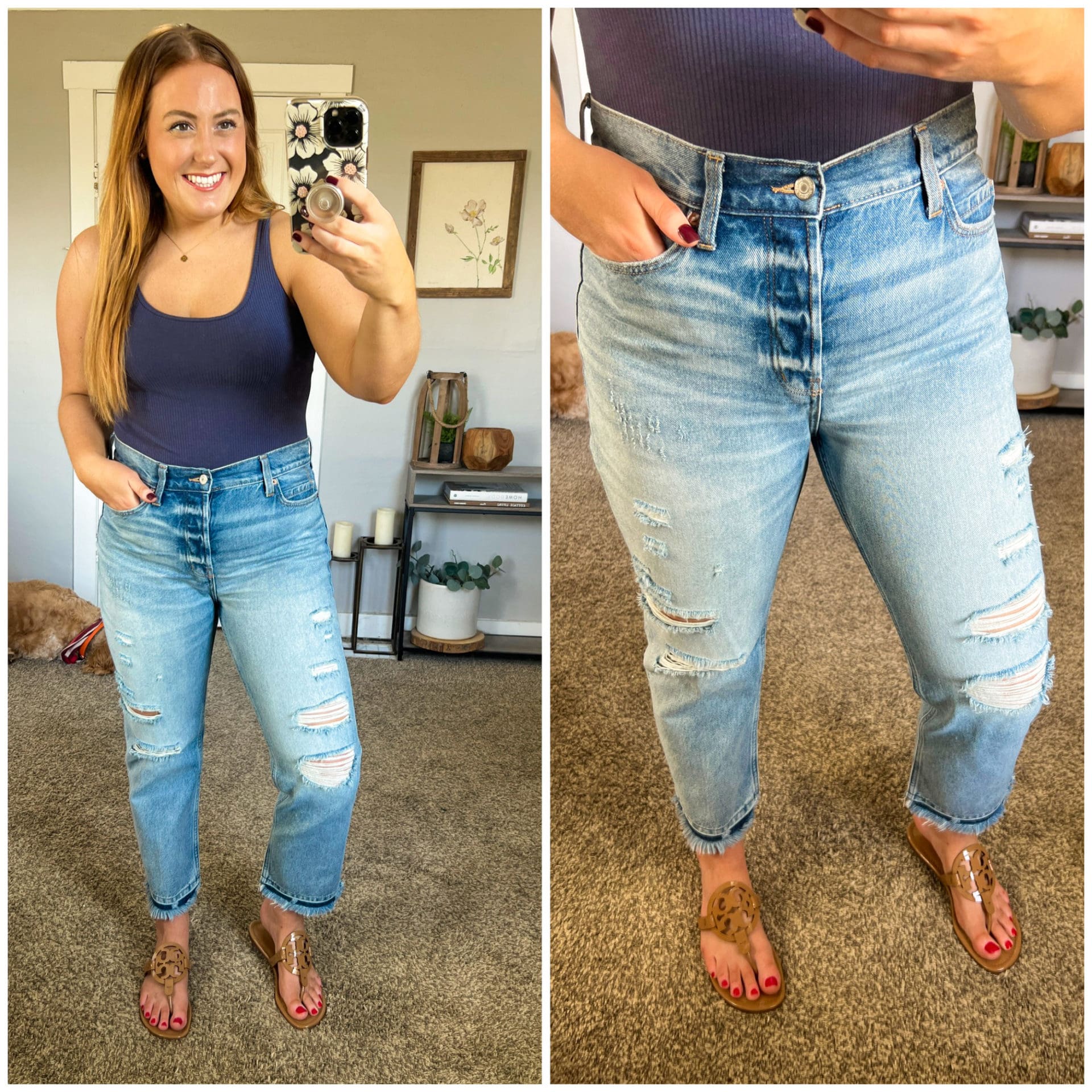Denim [TTS, wearing 8 regular for 5’5″] // Bodysuit [TTS, wearing large] // Sandals [size up .5]