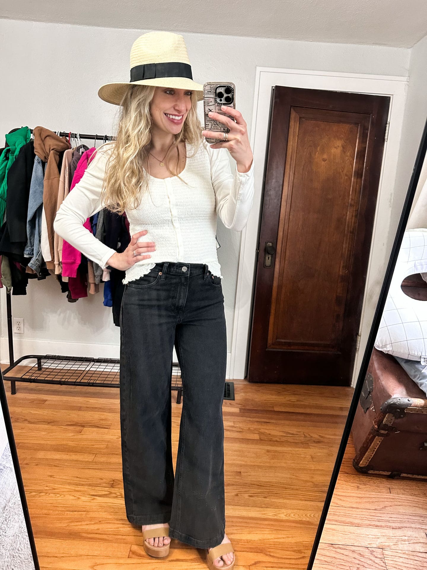 Top [true to size] // Jeans [size down if in between, wearing 26P for 5’4″] // Panama Hat // Wedge Sandals [true to size]