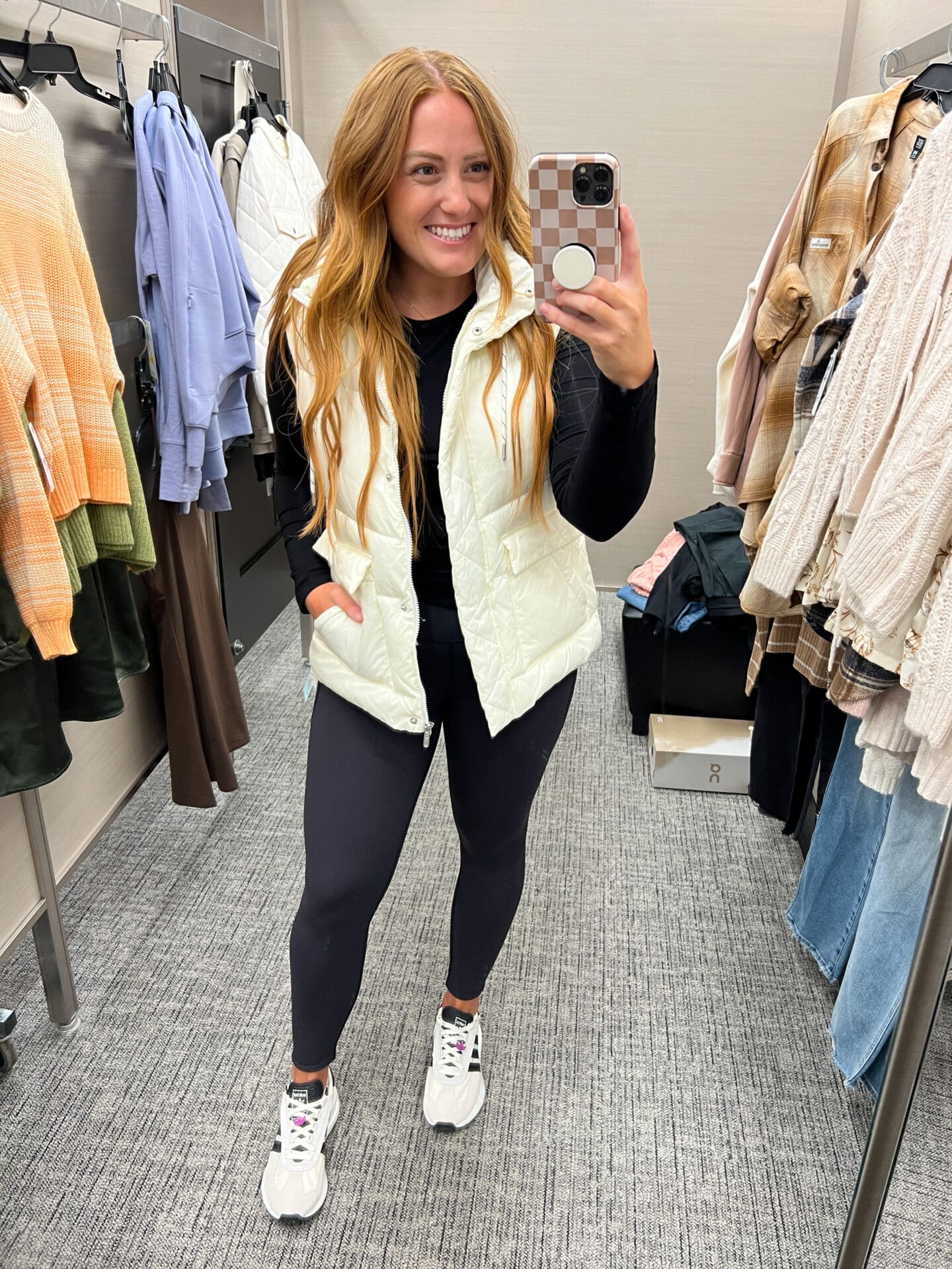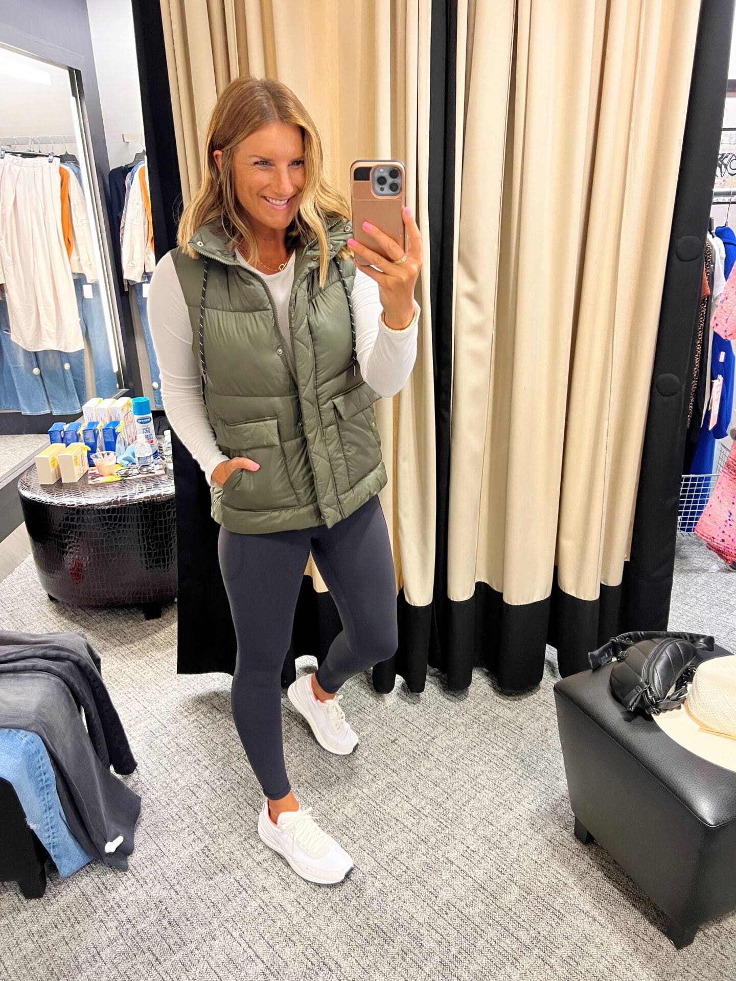 Zella Vest [true to size, wearing in small] / Zella Live In Leggings [true to size, wearing in small] / Halogen Shirt [ wearing a medium, size up if in between] / Nike Waffle Sneakers [size up one]